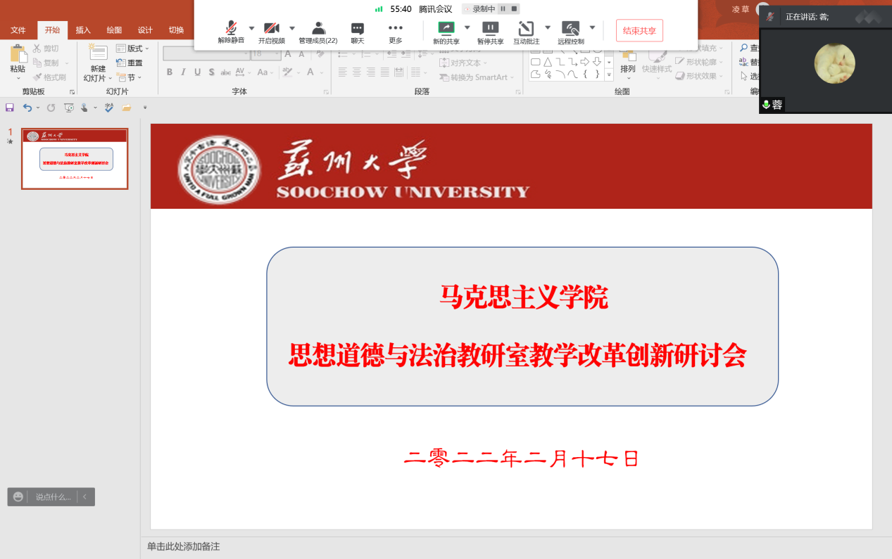 为进一步提高思想道德与法治课堂教学质量,提升立德树人成效,落实苏州大学教务部和马克思主义学院在线教学的相关要求,2022年2月17日,“德法”教研室采用视频会议的方式开展新学期教学改革研讨会。教务处刘方涛教授、马院副院长朱蓉蓉及教研室全体专任教师和兼职教师参加此次研讨会。研讨会由“德法”教研室副主任谢贵兵主持。