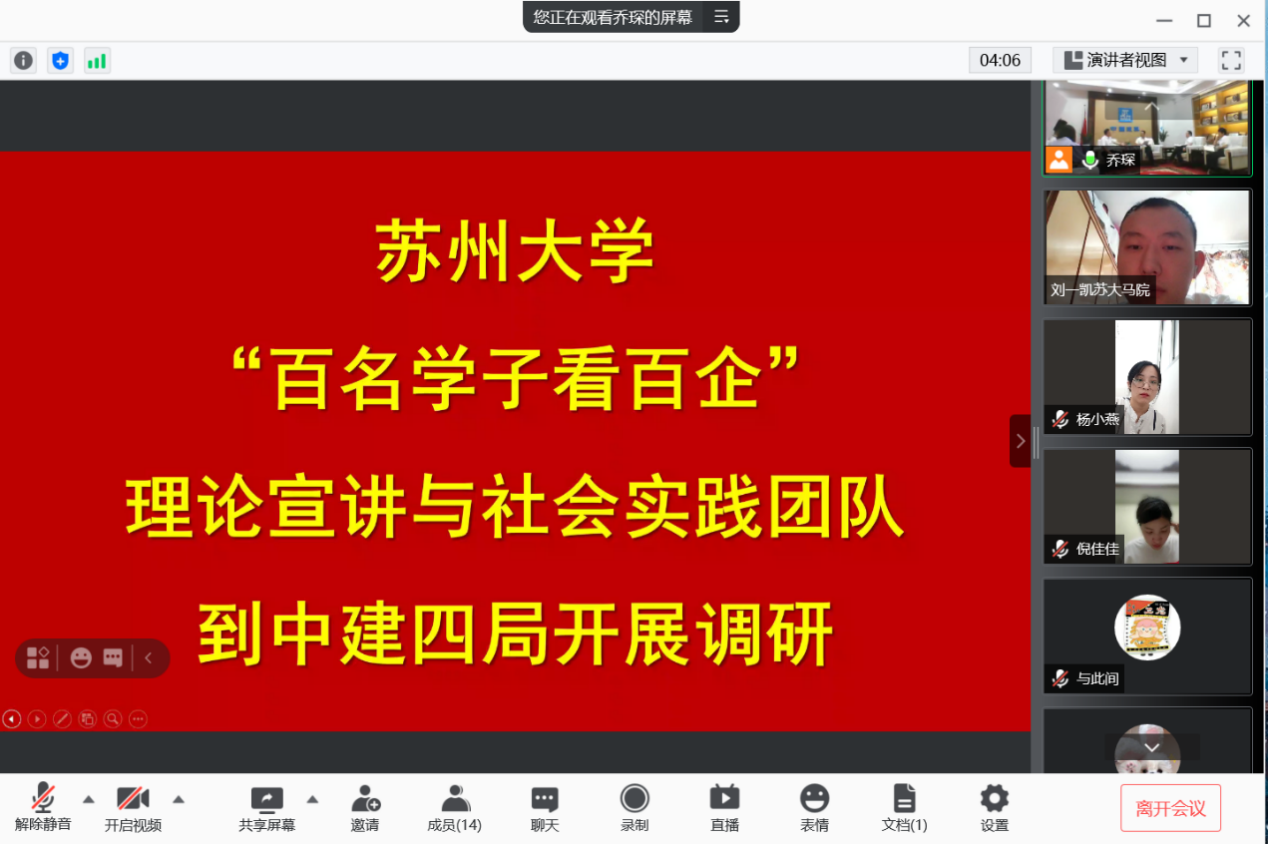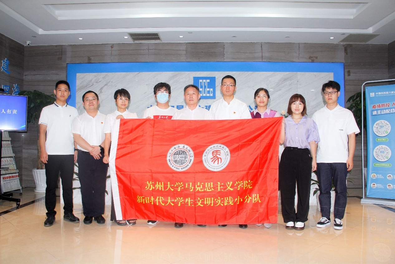 根据苏州大学党委统一部署,按照校团委和有关部门具体要求,为深入学习贯彻习近平总书记“七一”重要讲话精神,8月24日下午,苏州大学“百名学子看百企”理论宣讲与实践调研团队成员到央企中建四局六公司江苏分公司开展理论宣讲与实践主题活动。中建四局六公司江苏分公司党委副书记兼工会主席车其杰及公司有关部门代表与“百名学子看百企”实践团队师生进行了深入交流研讨。实践团队指导教师、苏州大学马克思主义学院院长田芝健教授,马克思主义学院青年教师王慧莹及实践团队成员毛瑞康、柯水华、王雪、乔琛等参加实地调研研讨,实践团队其他成员通过腾讯会议线上进行了交流研讨。