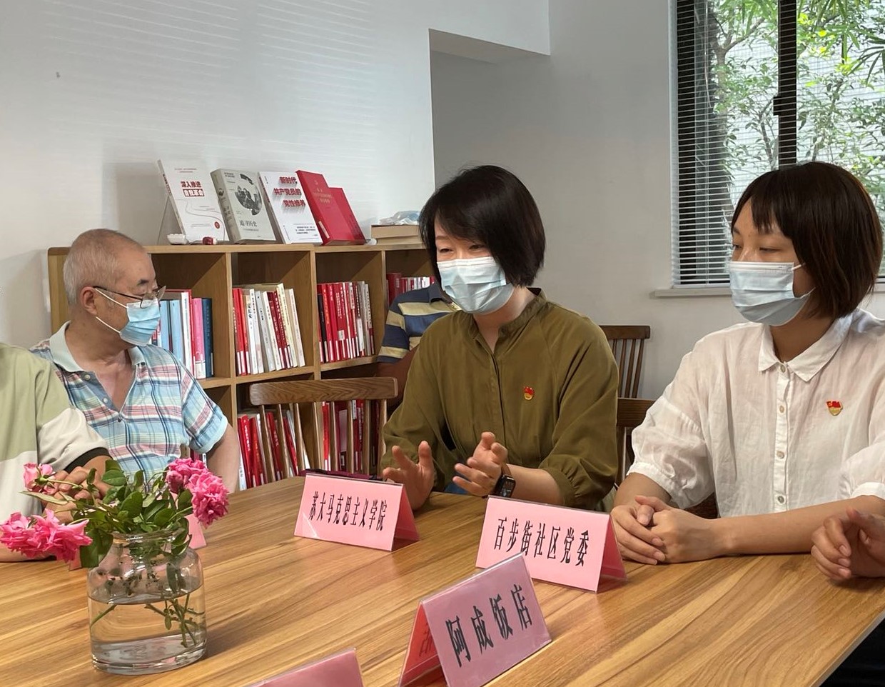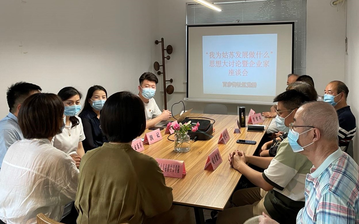 为响应落实苏州国家历史文化名城保护区党工委管委会、姑苏区委区政府对街道工作的各项要求,8月26日,应百步街社区党委邀请,苏州大学马克思主义学院综合办主任刘慧婷、学院研究生代表林心杰、张雪薇、夏桐等前往东吴饭店木梨谷读书室参加由百步街社区党委组织的“我为姑苏发展做什么”思想大讨论暨企业家座谈会。本次座谈会紧扣“创新”“发展”两个关键词,与会各代表围绕不同方面的发展问题展开热烈讨论。