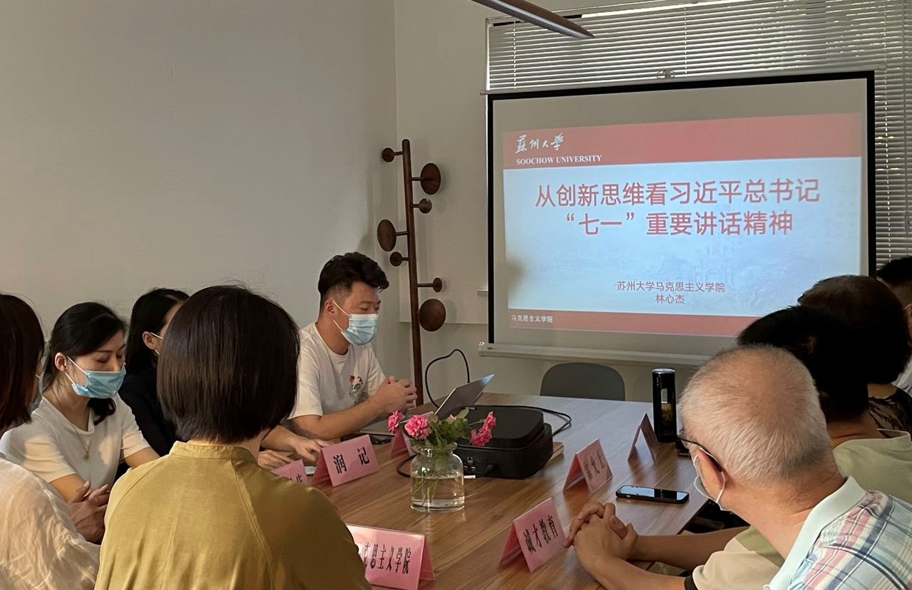 林心杰同学作“从创新思维看习近平总书记‘七一’重要讲话精神”主题宣讲。他从“创新思维是什么”“习近平总书记‘七一’重要讲话精神蕴含的创新思维”“学习习近平总书记‘七一’重要讲话精神中创新思维的重要性”“如何学习贯彻习近平总书记‘七一’重要讲话精神中的创新思维”四个方面和与会代表进行交流探讨。他指出,习近平总书记“七一”重要讲话精神中的创新思维有助于基层党员更好的坚定“四个自信”、践行初心使命、开展实践工作。基层社区和相关行业从事人员要不断提升创新思维能力,结合自身的实际工作,更好的为姑苏区、为苏州市发展做更大贡献。