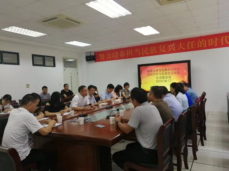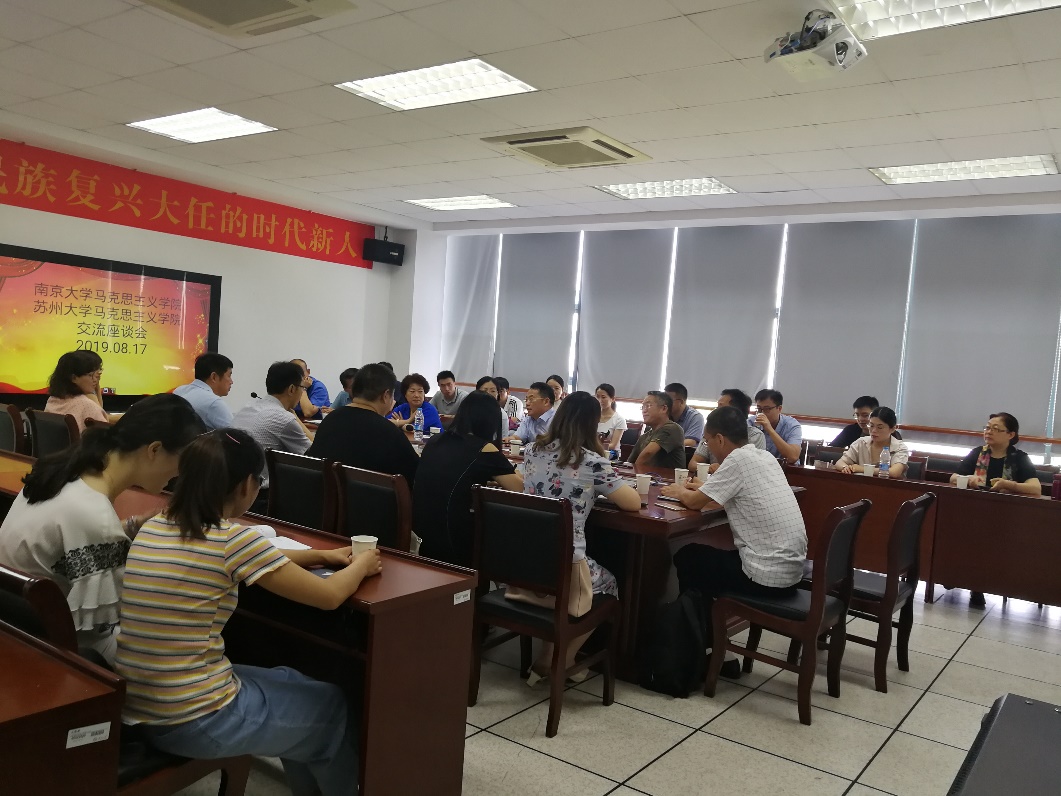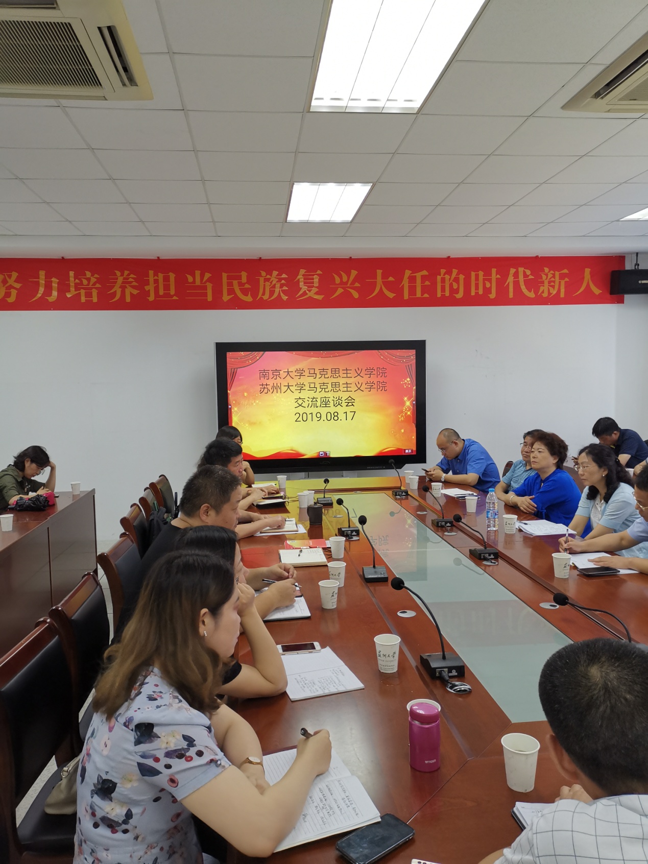 8月17日上午在苏州大学独墅湖校区606幢马克思主义学院418会议室,苏州大学马克思主义学院院长田芝健、党委书记张才君、副院长许冠亭等接待了来访的南大同行,双方进行了友好而深入的交流。苏州大学马克思主义学院马克思主义原理教研部主任范俊玉、研究生思想政治理论课教研部主任郑芸、思想道德修养与法律基础教研部主任顾宏松、思想道德修养与法律基础教研部党支部书记胡绿叶、毛泽东思想和中国特色社会主义理论体系概论教研部副主任副书记陈枢卉、中国近现代史纲要教研部副主任高志斌、形势与政策课教研部副主任王晓蕾以及郑善文等老师参加交流活动。
