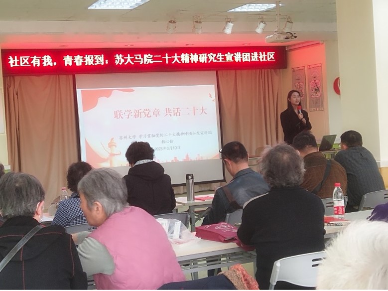苏州大学学习贯彻党的二十大精神博硕士生宣讲团成员韩心怡以“联学新党章,共话党的二十大”为主题,向潼泾一社区的党员同志、社区工作者和居民开展理论宣讲。韩心怡围绕党章发展历程、党章修改背景、党章修改的主要内容和新时代如何学习践行新党章等四个方面的内容进行了深入的讲解。首先,她分享了党章守护者张人亚的故事,带领大家重温党章的发展历程,并表示修改党章是深入学习贯彻党的创新理论的需要,是推进党和国家事业发展的需要,是深入推进新时代党的建设新的伟大工程的需要,更是推动贯彻落实党的二十大精神的需要。之后,她选取了党章修改的六点主要内容,围绕党章修正案调整完善党的奋斗目标的表述、对党员和党的干部提出的新要求等方面作出了详细讲解。最后,她号召大家要自觉主动地学习党章、遵守党章、践行党章,聚焦民心所向,用心、用情解决群众“急难愁盼”的问题,干在实处,务求实效。