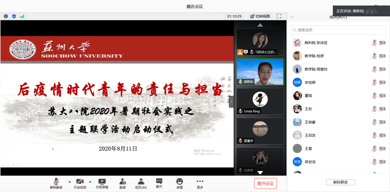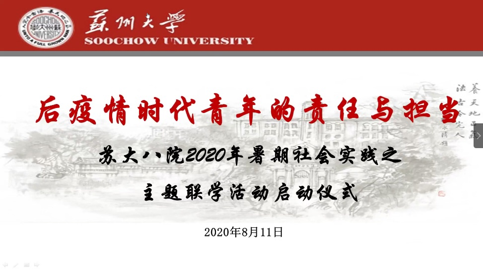 8月11日,苏州大学马克思主义学院在线举办“后疫情时代青年的责任与担当”苏大八院2020年暑期社会实践之主题联学活动启动仪式,苏州大学马克思主义学院党委书记张才君、外国语学院研究生辅导员李袁、数学科学学院研究生辅导员尹伊、材料与化学化工学部研究生辅导员曹文雯、计算机科学与技术学院研究生辅导员高珊、能源学院研究生辅导员严若今、公共卫生学院研究生辅导员陈玲、护理学院研究生辅导员赵鑫、马克思主义学院研究生辅导员金鑫,以及八个学院的研究生代表参加了本次启动仪式。本次活动由马克思主义学院组织,苏大七家二级学院(部)协办,马克思主义学院团委、研究生党支部、研究生会、思想政治教育研究会承办。启动仪式由马克思主义学院2019级硕士研究生林心杰主持。