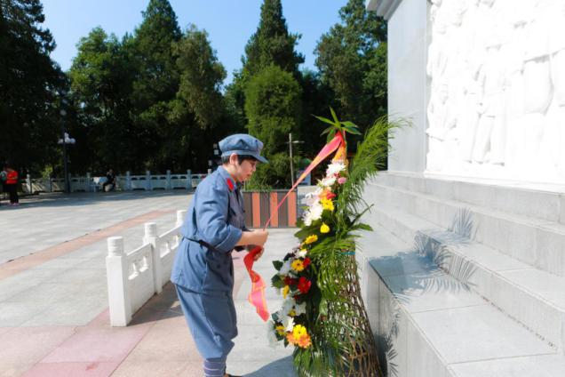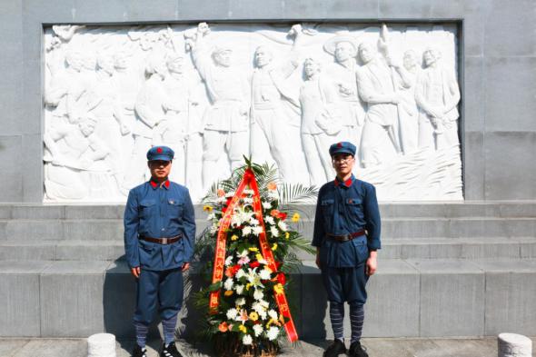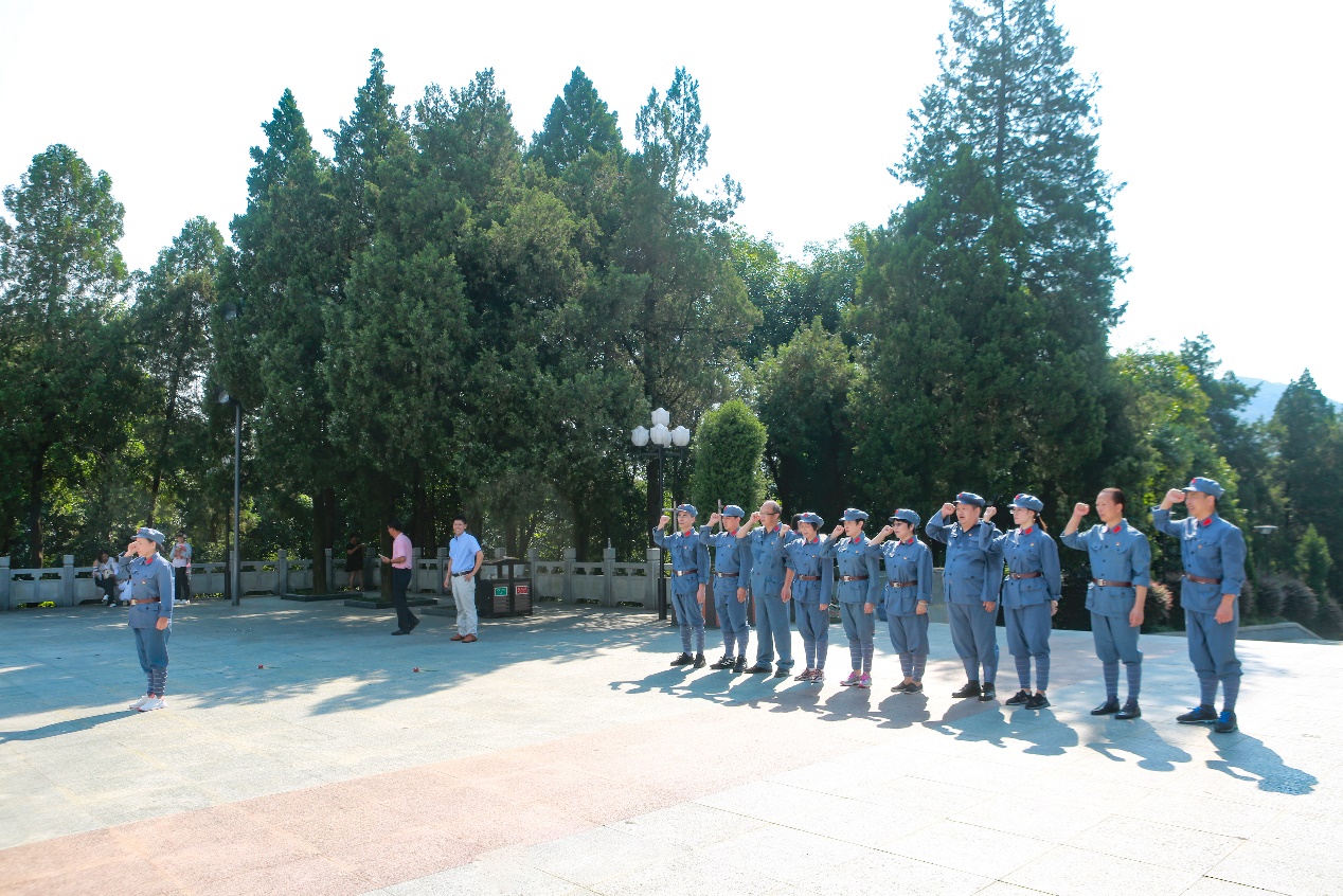 在金寨县红军广场,一座由刘伯承元帅亲笔题词“燎原星火”的革命烈士纪念塔在广场中央赫然矗立,彰显着生生不息的红色革命精神。学院教师身着红军装步入红军广场,沿着寓意59位金寨籍共和国将军的59级台阶拾级而上。随后,纲要党支部支委高志斌老师和基础党支部支委谢贵兵老师代表学院向金寨革命烈士敬献花篮,研修班领队朱蓉蓉副院长怀着对革命先烈的敬仰之情为花篮整理缎带。纲要党支部范敏华书记带领全体党员面对鲜红的党旗,庄严地举起右拳,重温了入党誓词:“我志愿加入中国共产党……为共产主义奋斗终身,随时准备为党和人民牺牲一切,永不叛党。”铿锵有力的宣誓声,表达出参加研修的党员教师坚贞忠诚、牺牲奉献、永跟党走的坚定信念;增强了教师们不忘初心、牢记使命的责任与担当意识。