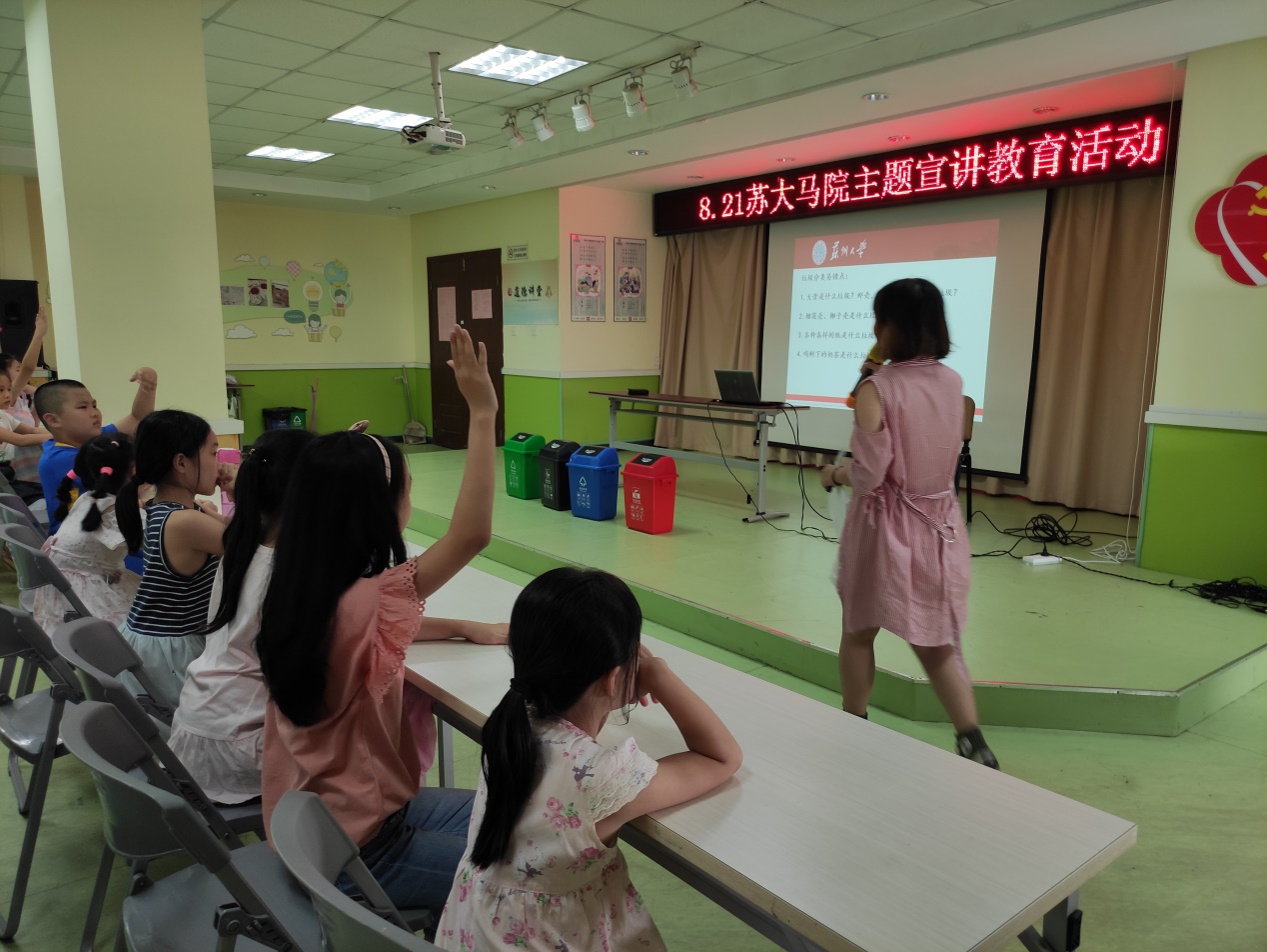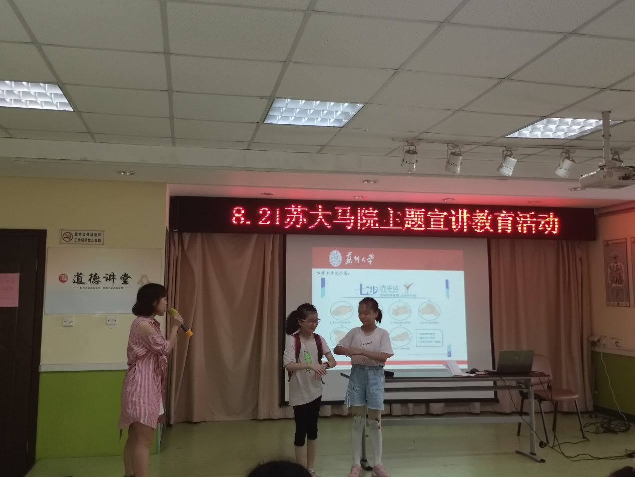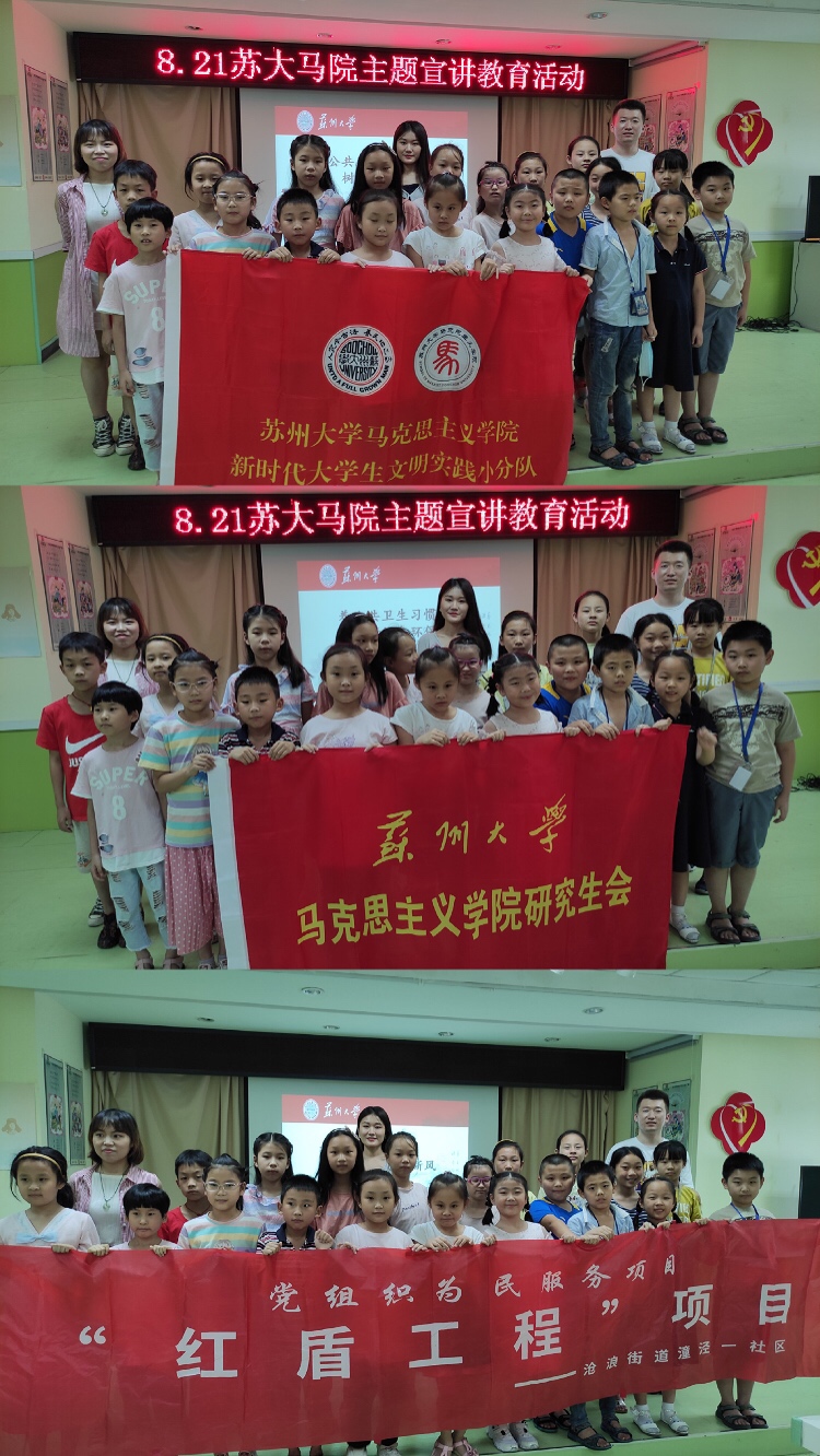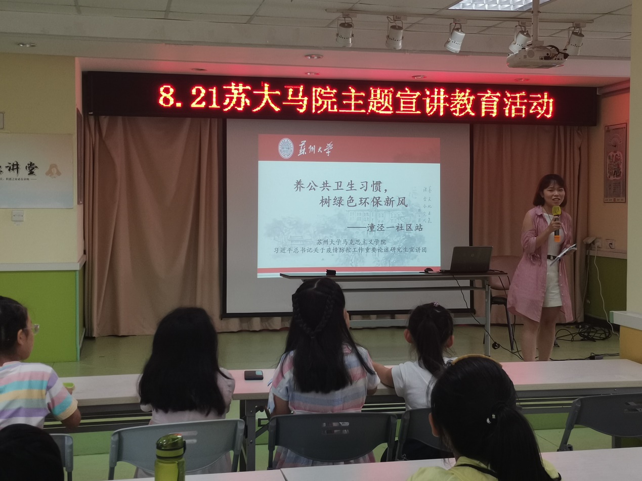 8月21日,苏州大学马克思主义学院“习近平总书记关于疫情防控工作重要论述研究生宣讲团”赴江苏省苏州市姑苏区潼泾一社区,围绕社区小学生为中心,开展了“养公共卫生习惯,树绿色环保新风”主题宣讲教育活动,团队成员通过多种多样的形式引导孩子们建立正确的健康观和环保观,更好的实现自己健康成长。