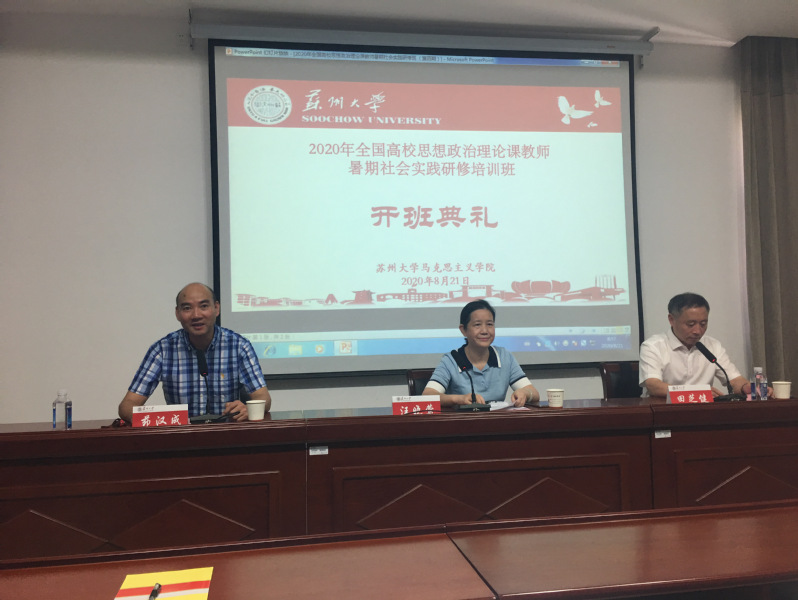 8月21日上午,在苏州大学培训中心102举行了开班仪式。本次开班仪式由苏州大学马克思主义学院副院长茆汉成主持。首先,苏州大学马克思主义学院院长田芝健教授对各位学员的到来表示热烈的欢迎,并介绍了本次研修班的具体安排。随后,东华理工大学马克思主义学院院长汪晓莺教授为学员们作了开班动员讲话,并对学员们提出几点具体要求,希望学员们通过本次研修班开阔视野,提高教学能力等。