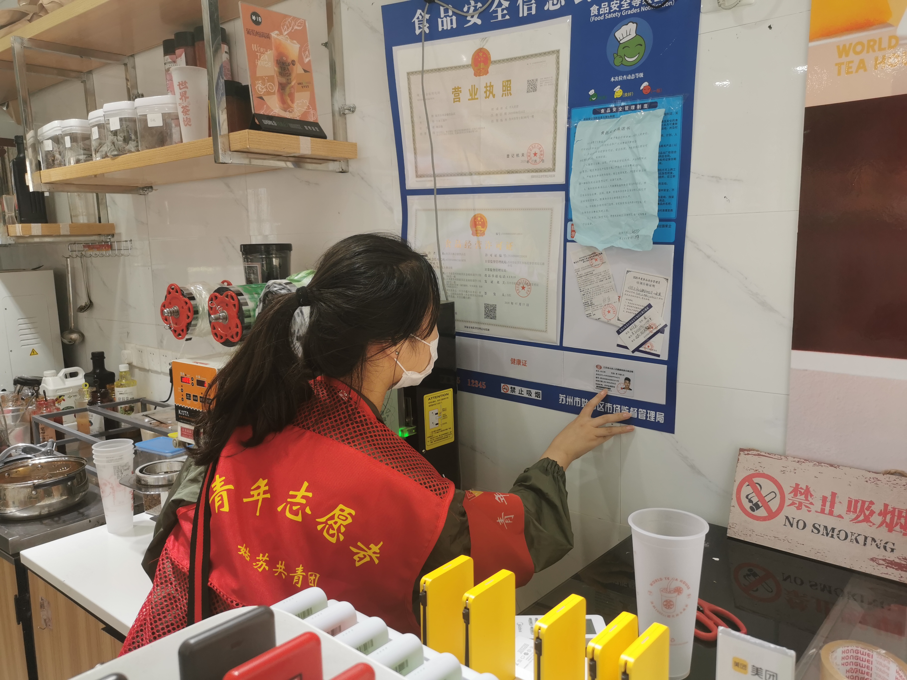 青年志愿者前往观前、石路、双塔、虎丘四个街道辖区,配合姑苏区市场监督管理执法队员张贴食品安全示范城市海报、协助检查餐饮企业、做好数据统计等工作,深入沿街商铺和居民社区开展科普宣教,向群众宣传并深入推进姑苏区省级食品安全示范城市创建的核心内容,提高社会公众食品安全素养和食品安全知识知晓率,促进公众食品安全消费行为健康理性,实现社会共建共治。