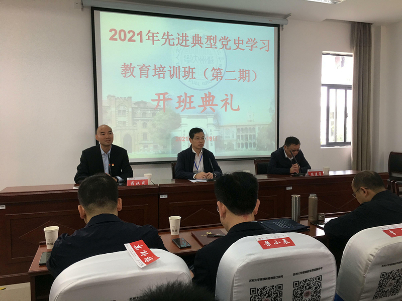 10月19日上午,苏州大学马克思主义学院党委书记陈建军、山西移动党委办公室副主任李军及相关培训学员在苏州大学培训中心105会议室举行开班典礼。陈建军书记致欢迎辞并指出,开展此次党史学习教育培训,目的是为广大党员干部树立正确的党史观,从党史中汲取继续前进的智慧和力量。李军副主任作开班动员讲话,他对全体学员提出了三点要求:第一,要明确学习意义,提高思想认识。开展党史学习教育是深化初心使命的客观需要,也是弘扬革命精神、传承红色基因的必然要求。第二,要把握要求,提升能力水平。要做到学史明理、学史增信、学史崇德、学史力行。第三,要珍惜机会,确保预期效果。本次开班典礼由苏州大学马克思主义学院副院长茆汉成主持。