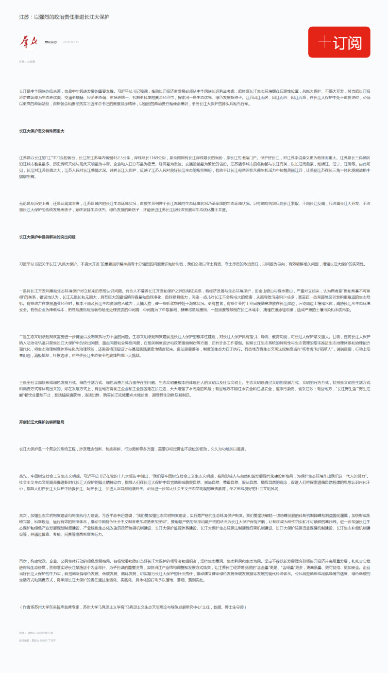 苏州大学马克思主义学院方世南教授《江苏:以强烈的政治责任推进长江大保护》文章上学习强国