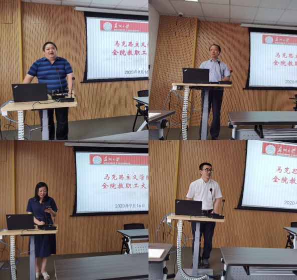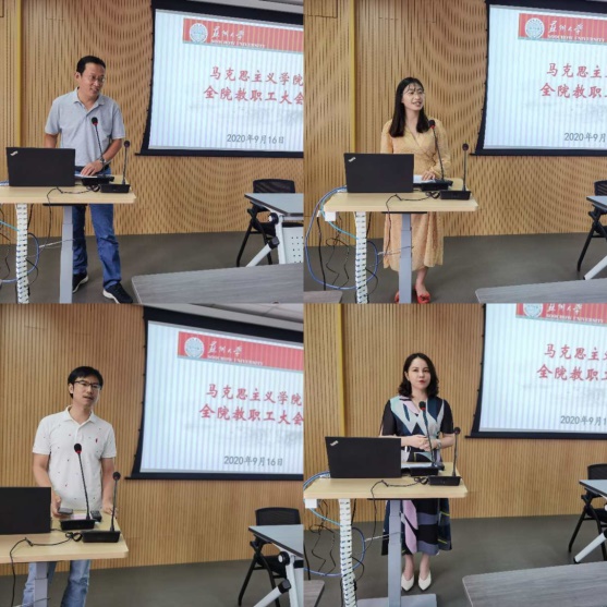 随后各教研室主任在会议上依次进行了发言,主要就上学期的工作进行了总结,并汇报了新学期的规划。在总结中,各教研室主任指出,针对课程特点,分别开展了有针对性的教学研活动,不少教研室都取得了有显示度的成绩,多名教师在省市级比赛中获奖。针对疫情期间教学的要求,各教研室及时在学院的指导下开展了线上教学的一系列工作,保障了教育教学工作的正常开展。对于秋季工作的规划与预期,各教研室在科研、教学、社会服务、人才梯队建设等方面基于教研室实际情况,提出要继续从转化教学形式,凝练教学改革新思路,强化科研冲刺等方面展开工作。