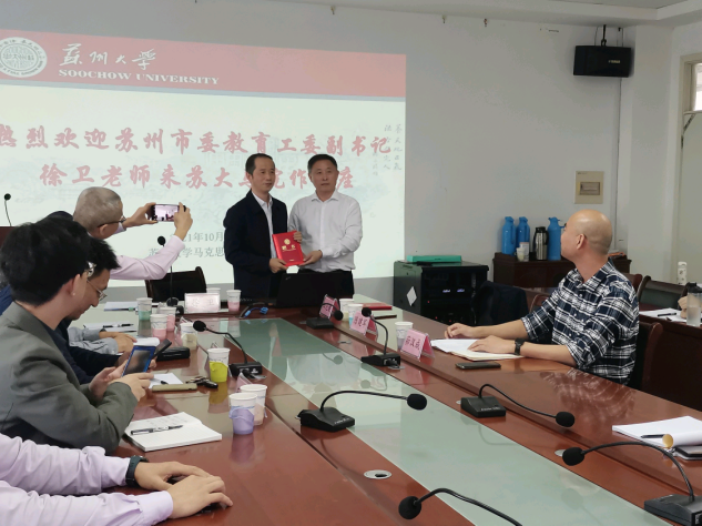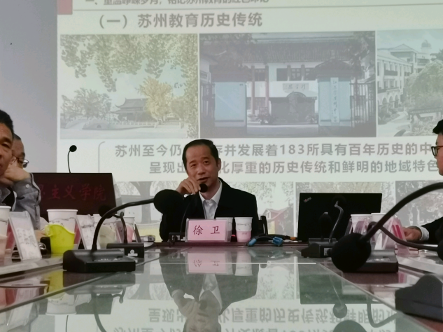 10月29日下午,苏州大学形势与政策大讲堂暨苏州市百名局长“进思政课堂”百场宣讲活动在苏州大学独墅湖校区606幢6418会议室举行。这是苏州大学思政课实践教学改革的创新探索。苏州市委教育工委副书记徐卫、苏州市教育局德育处处长朱文潇、苏州市委教育工委秘书处副处长游波、苏州市教科院教研员特级教师朱开群、苏州市教育局德育处王品越、马克思主义学院党委书记陈建军、院长田芝健、副院长茆汉成、院长助理孔川与马院学科教学(思政)专业研究生参加了本次活动。讲座由茆汉成副院长主持。