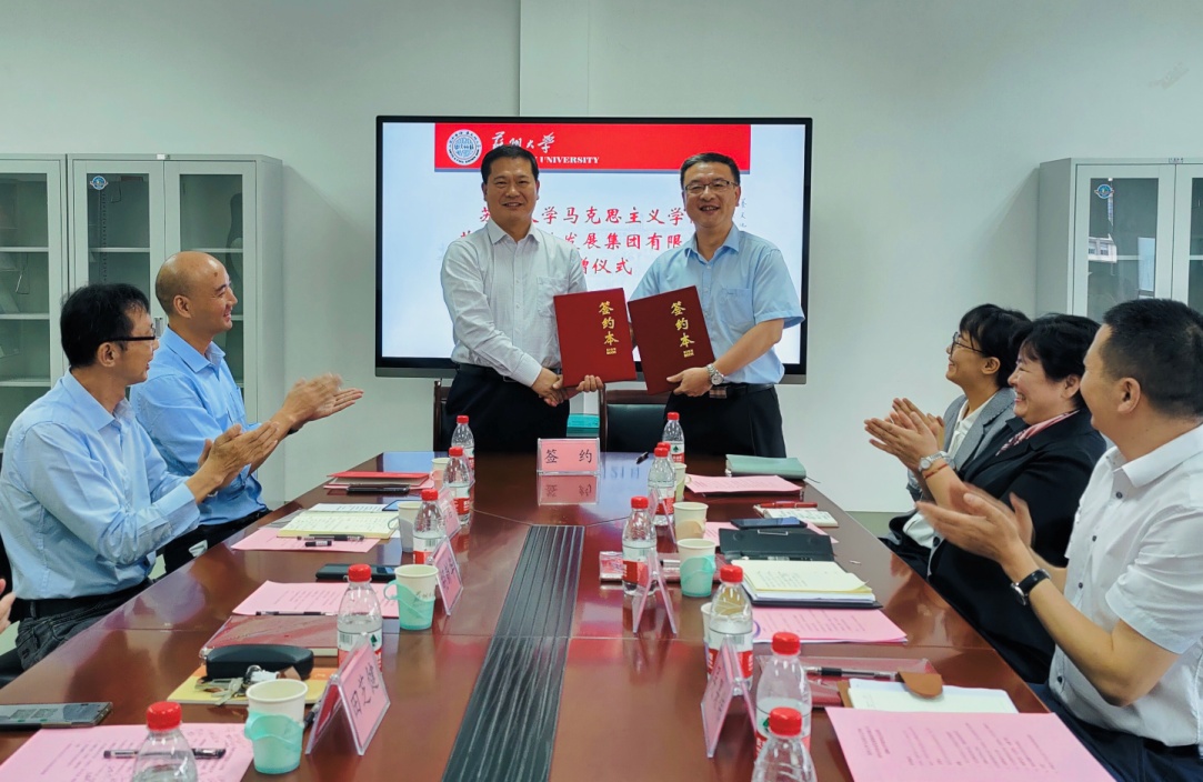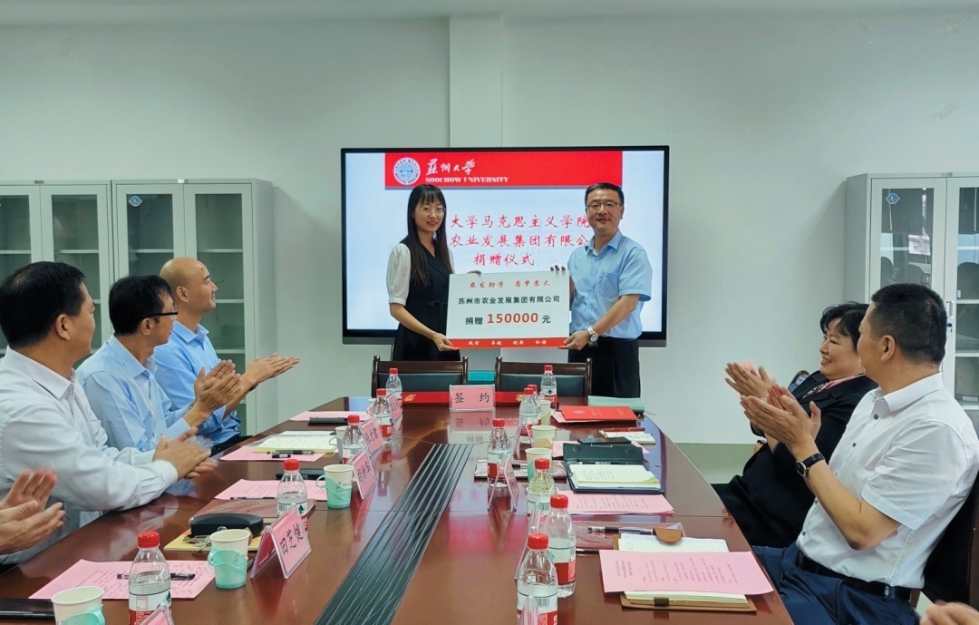 在俞颂家董事长、竺可榕总经理助理、华吉毅督导员、刘子静部长、张才君书记、茆汉成副院长等共同见证下,苏州市农业发展集团有限公司总经理吴果伟与苏州大学马克思主义学院院长田芝健签署了战略合作协议、与苏州大学发展委员会办公室主任胡新华签署了捐赠协议,定向捐赠15万元助学金用于帮助苏州大学马克思主义学院困难学子,并与苏州大学马克思主义学院团委书记金鑫进行捐赠交接。