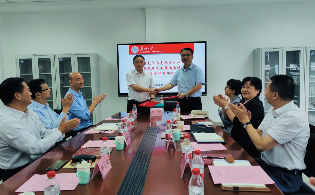 9月21日下午,苏州大学马克思主义学院与苏州市农业发展集团有限公司在独墅湖校区6420会议室举行了战略合作签约暨捐赠仪式。苏州市农业发展集团有限公司党委书记、董事长俞颂家,党委副书记、总经理吴果伟,党委委员、总经理助理竺可榕,督导员华吉毅,团委书记丁妍;苏州大学发展委员会办公室主任胡新华,发展办基金会(董事会)管理部部长刘子静,苏州大学马克思主义学院党委书记张才君,党委副书记、院长田芝健,副院长茆汉成,团委书记金鑫和研究生代表等出席签约仪式。仪式由张才君书记主持。