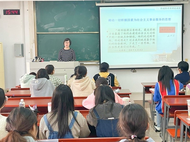 按照课程进度,牟丽老师以《毛泽东思想和中国特色社会主义理论体系概论》教材第四章第一节“初步探索的重要理论成果”中的《论十大关系》为主要内容展开授课。牟老师理论联系实际、深入浅出地讲授了社会主义建设初期毛泽东强调要重点把握好的十对重大关系,注意把握教学内容的学理性、严谨性。学生在课堂上听讲认真,积极参与互动,形成了良好的课堂氛围,达成很好的教学效果。