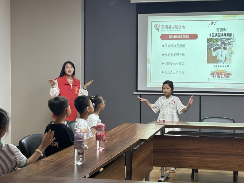 实践团成员以质朴深情的语言讲述雨花台革命烈士的事迹,生动再现波澜壮阔的革命岁月,使青少年深刻感悟革命先辈为理想信念不惜牺牲的伟大精神。团队还精心设计知识问答等互动环节,激发青少年对党史知识的兴趣,引导其主动思考探索,现场参与热情高涨;红歌传唱环节中,实践团成员带领青少年齐唱经典红歌,激昂歌声在社区回荡,将对革命先辈的敬仰与对祖国的热爱传递开来,集中展现出青少年对红色精神的理解与传承。