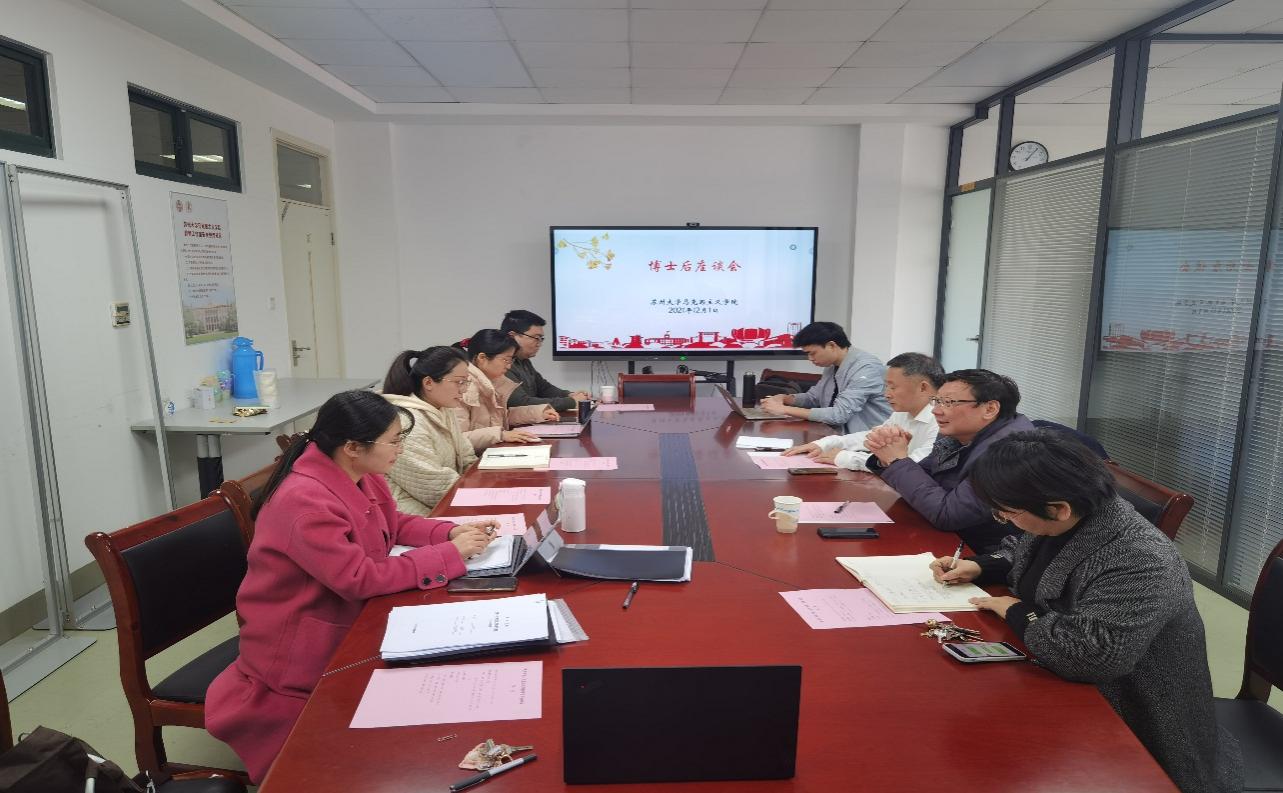 为进一步推动党史学习教育落地落实落细,加强博士后队伍建设,12月1日下午,苏州大学马克思主义学院召开博士后座谈会。会议在独墅湖校区606号楼6420会议室举行。学院党委书记陈建军、院长田芝健,副院长朱蓉蓉,师资与人才工作专员刘媛媛,博士后代表王慧莹、吉启卫、张洋阳、张建晓、宋辰熙、于佳、顾梦婷、李亚熙等青年教师参加了会议,会议由陈建军主持。