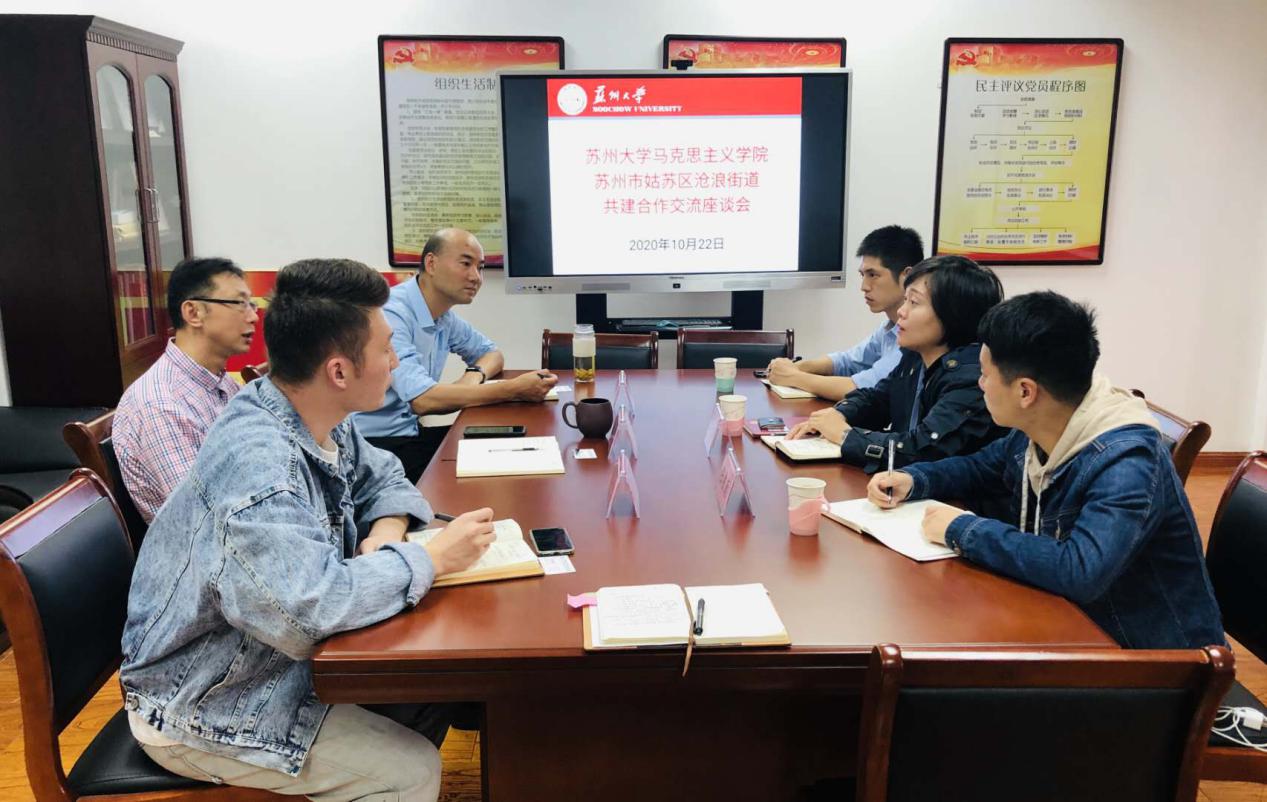 10月22日下午,苏州大学马克思主义学院、苏州市姑苏区沧浪街道共建合作交流会在独墅湖606#6411会议室举行。中共苏州姑苏区沧浪街道管理办副主任、党委副书记、党工委副书记、政协工委主任章云丽,沧浪街道组织人事处张鲁康、冯青,苏州大学马克思主义学院党委书记张才君、副院长茆汉成、团委书记金鑫、研究生党员服务中心执行主任林心杰参加了此次共建合作交流会。