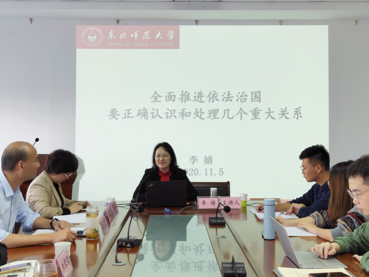 李婧教授在向师生们介绍全面依法治国发展历程的同时,指出本次讲座的核心内容是全面依法治国应当处理好的几对关系,分别是党的领导和法治、人民民主与法治、德治与法治以及法治创新与法治借鉴。