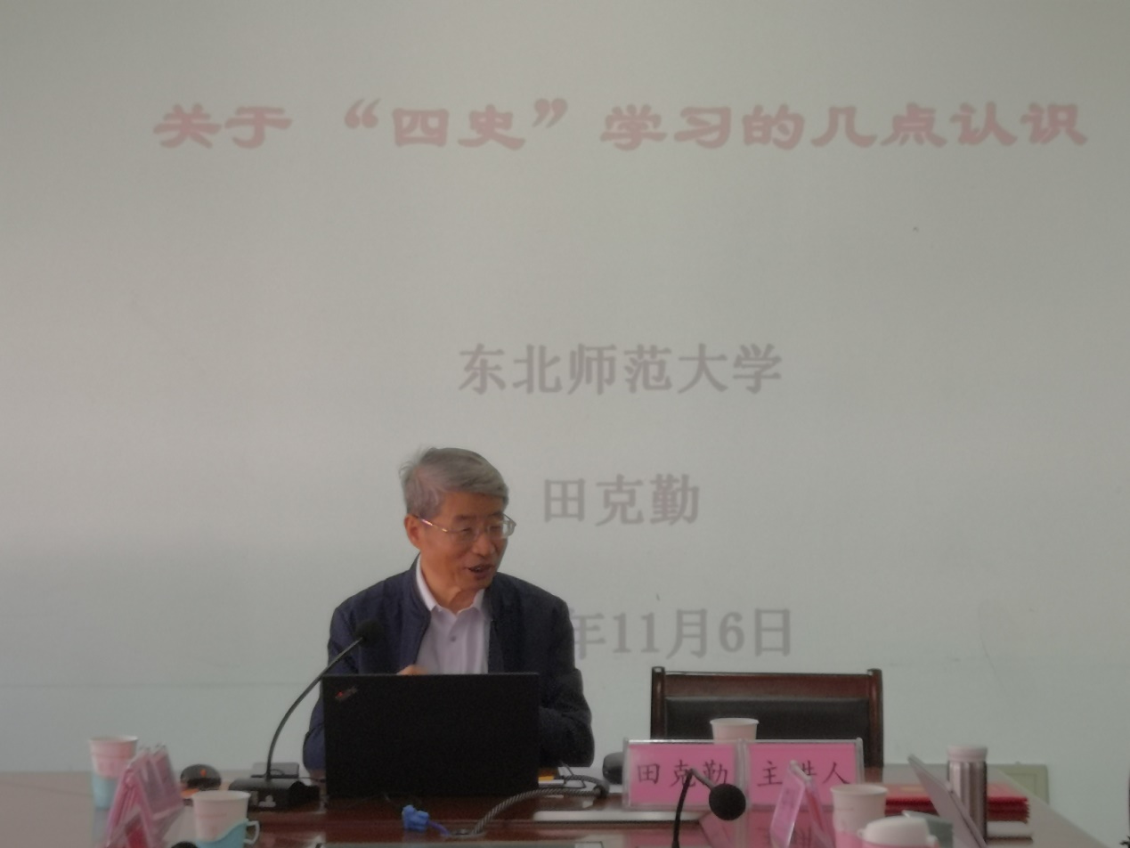 田克勤教授以“关于‘四史’学习的几点认识”为题,首先向同学们阐述了“四史”的提出背景及其内在关系;然后又介绍了“四史”即中国共产党历史、中华人民共和国历史、改革开放历史以及社会主义发展史的内涵及其定位,以便于同学们能够认识到“四史”的学习具有促进人民更好地认识国情、更好地认识党和国家发展大势、更好地认识历史发展规律、更加能动地推进各项工作等重要作用;最后,田教授提出要从辩证唯物主义和历史唯物主义两个角度出发,在“四史”学习的过程中既不能否认理论的指导作用,又要注重用实践去检验真理,坚持二者的结合。