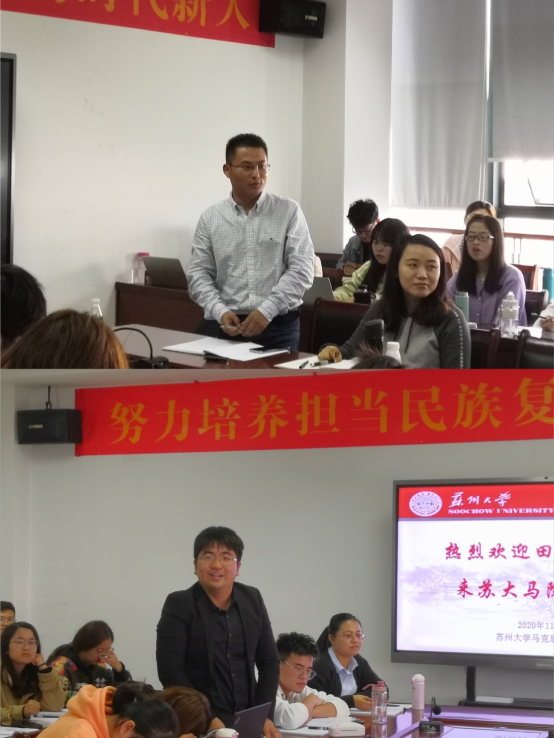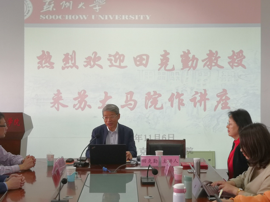11月6日,东北师范大学马克思主义学院田克勤教授应邀到苏州大学独墅湖校区一期606-6418会议室为苏州大学马克思主义学院研究生作“关于‘四史’学习的几点认识”学术讲座。东北师范大学马克思主义学院田克勤教授、李婧教授,苏州大学马克思主义学院党委书记张才君、院长田芝健、王淼教授、王晓蕾老师、2020级博士和硕士研究生参与了本次活动。活动由马克思主义学院主办,院团委、研究生党支部、研究生会、思想政治教育研究会承办,讲座由张才君书记主持。