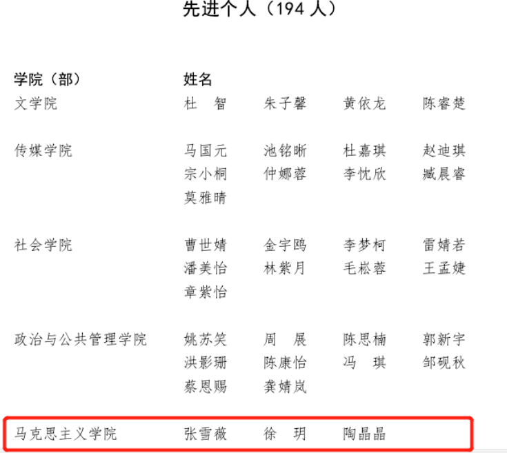 马克思主义学院被授予2021年苏州大学暑期社会实践“优秀组织”称号;六支实践团队,“百名学子看百企”理论宣讲与实践调研团队、“习近平总书记关于党的历史的重要论述”研究生宣讲团、薪火相传实践团、“振兴逐梦”实践团、火红石榴籽团队、“流水琴川”实践团荣获校级“优秀团队”称号;田芝健院长和金鑫老师荣获校级“优秀指导老师”称号;硕士研究生张雪薇、徐玥、陶晶晶荣获校级“先进个人”称号;调研报告《探索沙家浜精神融入高校党史学习教育新路径研究》被评为校级“优秀调研报告”。