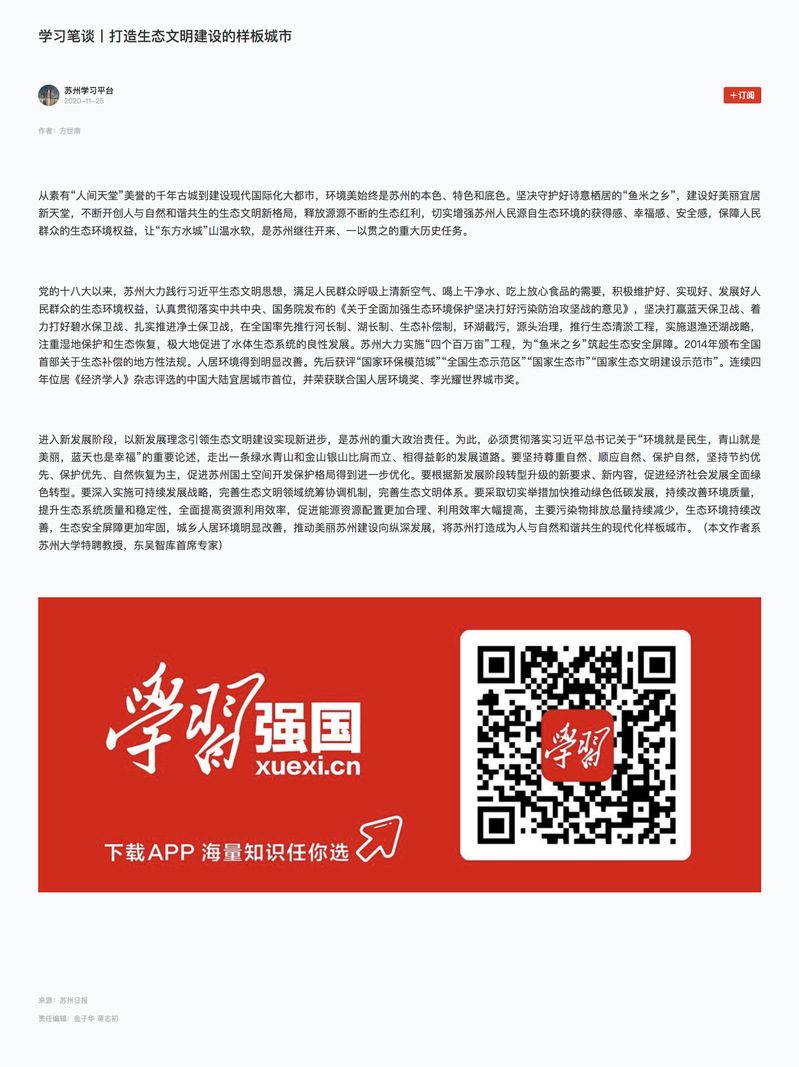 “学习强国”苏州学习平台推出苏州大学马克思主义学院方世南教授的“学习笔谈”——《打造生态文明建设的样板城市》
