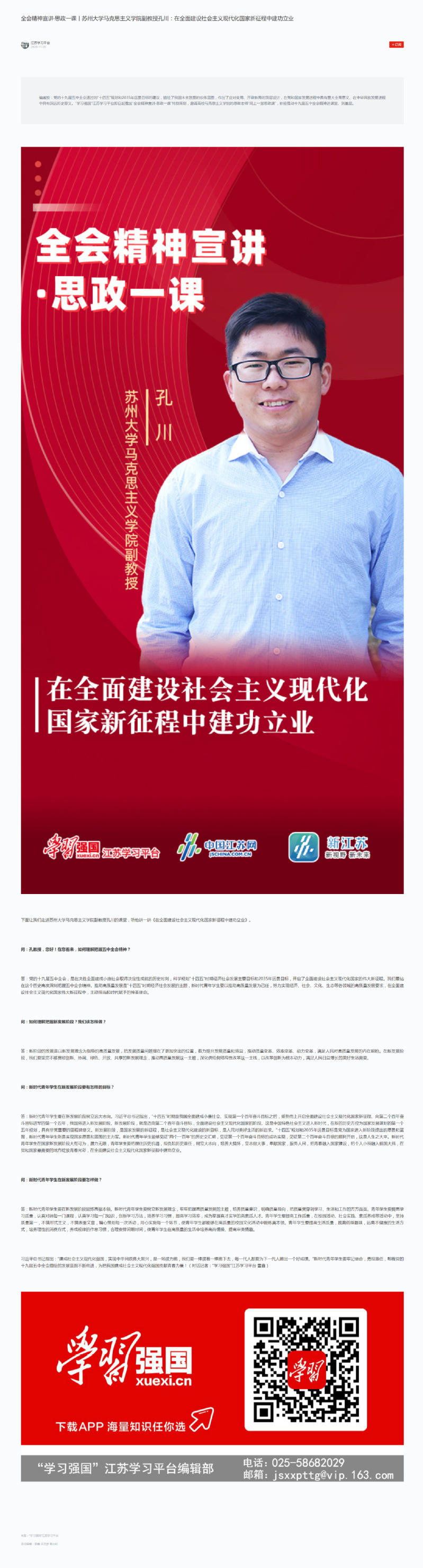 "学习强国"江苏学习平台推出苏州大学马克思主义学院副教授孔川的“思政一课”——《在全面建设社会主义现代化国家新征程中建功立业》