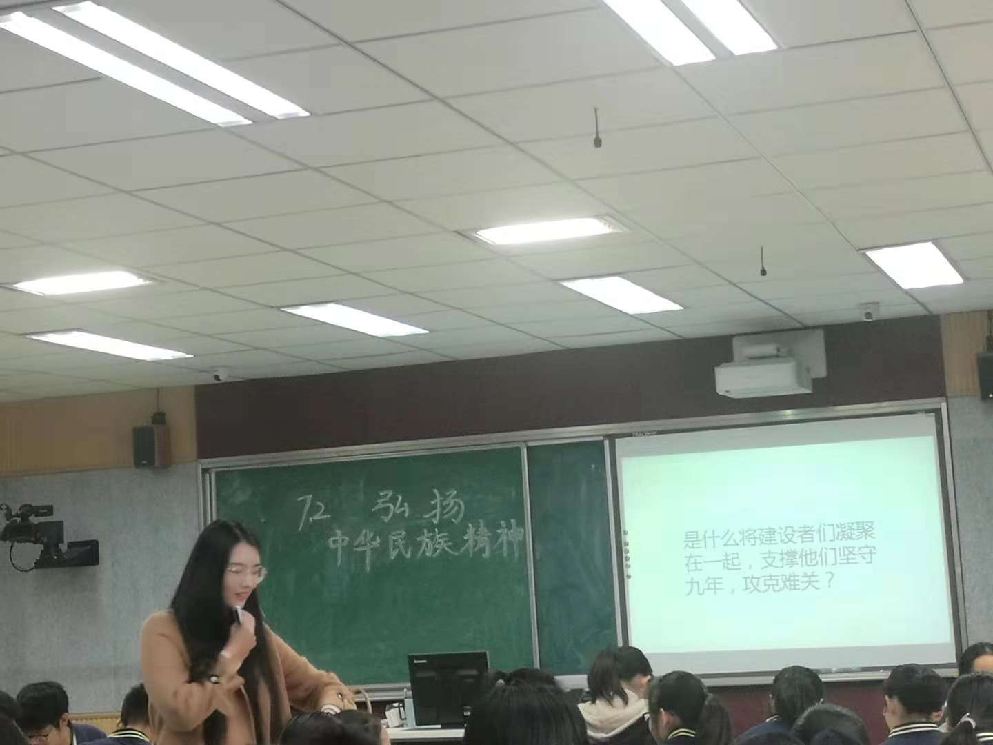 肖小芬将课堂分为“精神之形成于传统”、“精神之熔炼与抗争”、“精神之彰显于伟大事业”三个模块,由当前的热点事件“杜嘉班纳辱华”事件作为导入,引出爱国情感,导入中华民族精神。然后,她以各个阶段中华民族精神的代表人物,讲解民族精神的内涵,总结中华民族精神的特征;接着,重点分析“大庆精神”,引导学生探讨“为什么要弘扬和培育中华民族精神”的问题;最后,用学生角色扮演的课堂活动,让学生做弘扬和培育民族精神的践行者,并以“精神虽宏达,体现却具体”这句话结束课堂,鼓励学生积极实践。