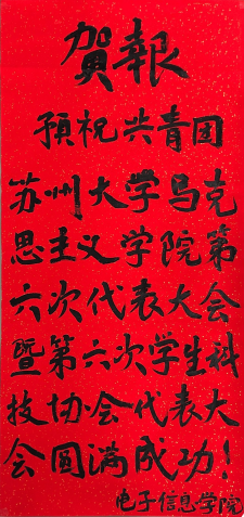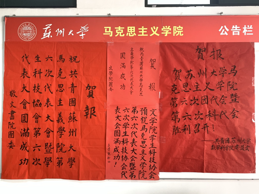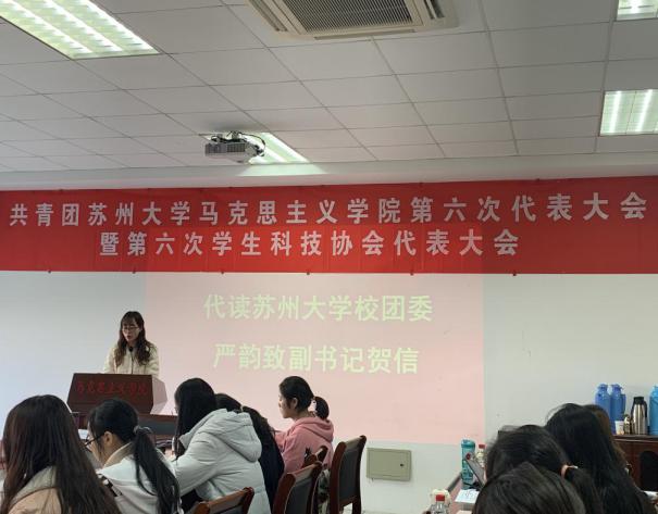 苏州大学团委副书记严韵致向大会发来贺信,她在贺信中表示苏州大学马克思主义学院团委扎实推进各项工作稳步进行为学校的改革发展做出贡献,并祝愿大会顺利召开。苏州大学研究生院胡玮老师表示马克思主义学院团委一直坚持以文化人、立德树人的理念举办了丰富多彩的活动,并从团委改革建设、加强学院沟通配合等方面为马院团委发展提出建议。政治与公共管理学院团委书记单杰肯定了马院团委在各方面取得的成绩,并希望能与马院继续相互配合,共同书写共青团工作的新篇章。教育学院、光电科学与工程学院也发来贺信祝贺大会的召开,希望彼此能在今后工作中发挥彼此优势,加强协作。文学院、敬文书院、计算机学院、数学科学学院、电子信息学院同时送来贺报。