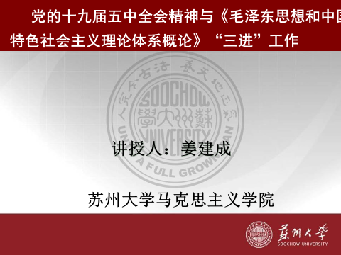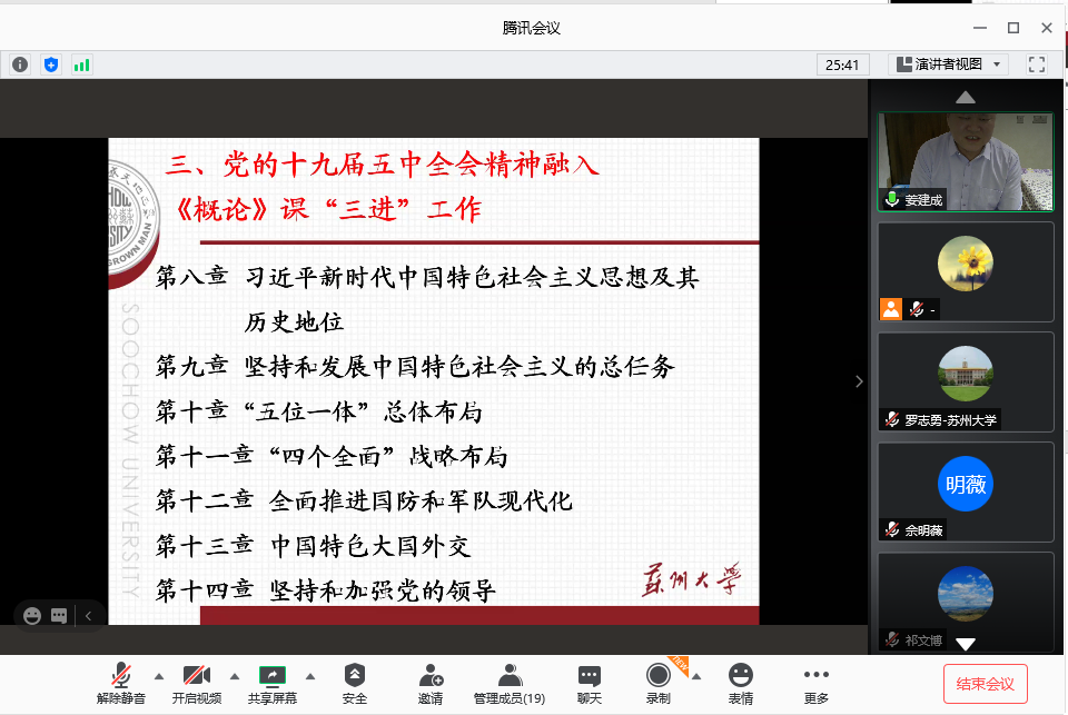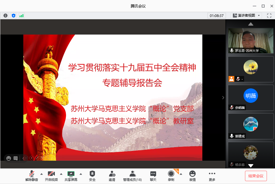 2020年12月2日,为了贯彻落实苏州大学党委《关于深入学习宣传贯彻党的十九届五中全会精神的通知》,及时将党的十九届五中全会精神融入“概论”课教学中,概论党支部邀请了马克思主义学院党委纪检委员、苏州大学党的十九届五中全会精神宣讲团成员姜建成教授作专题辅导报告。报告会采用腾讯视频会议形式,支部书记罗志勇主持了报告会,全体党员及三位民主党派教师应邀参加了学习。