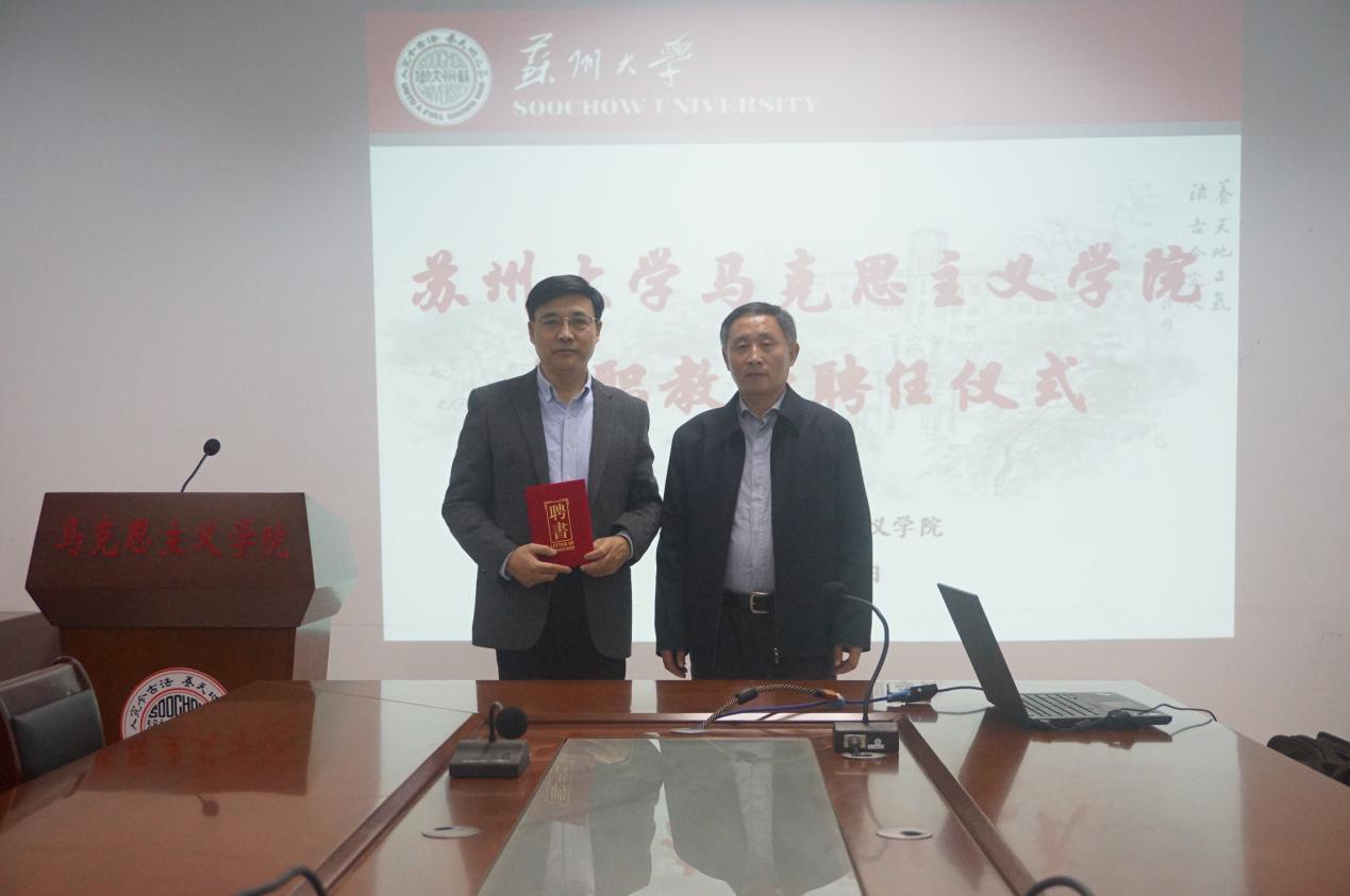 讲座结束后,学院举行了聘任韦锋、韦刚为马克思主义兼职教授的聘任仪式。聘任仪式上,田芝健院长致辞并向韦锋、韦刚兼职教授颁发了聘书,韦锋、韦刚两位兼职教授表示将认真履行兼职教授责任,一如既往地关心和支持苏州大学马克思主义学院发展,共同为立德树人和干部培训而努力。