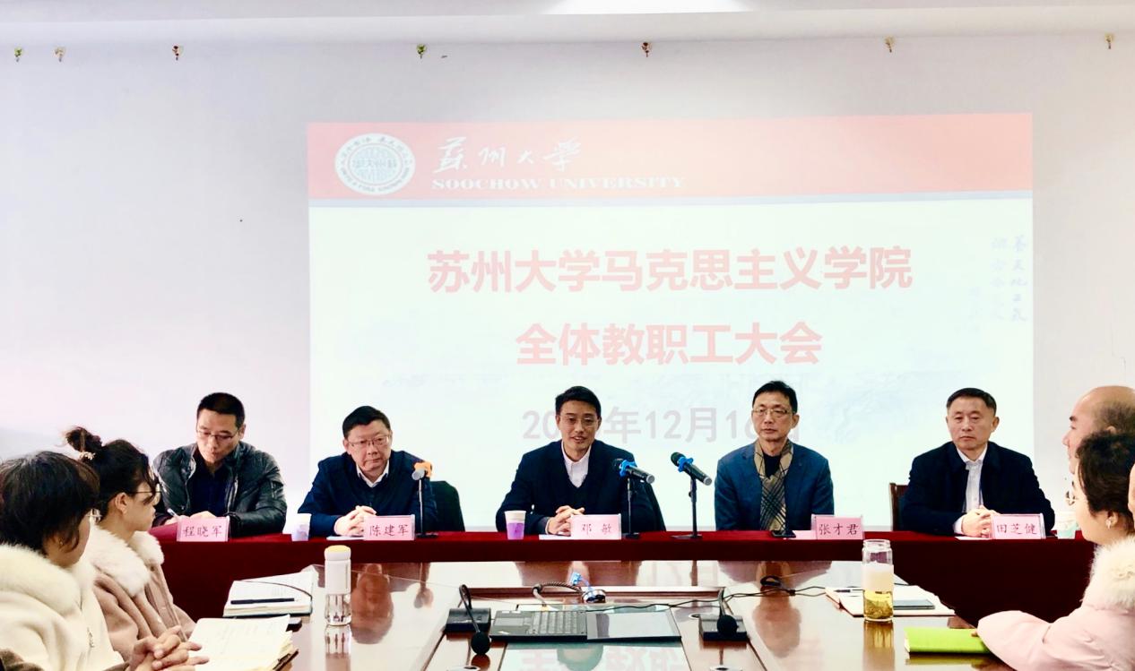 12月16日,马克思主义学院召开教职工会议。校党委副书记邓敏到会讲话,校党委组织部副部长程晓军到会宣布学校干部任免决定。会上张才君、陈建军、田芝健分别作表态发言。会议由院党委副书记、院长田芝健主持。