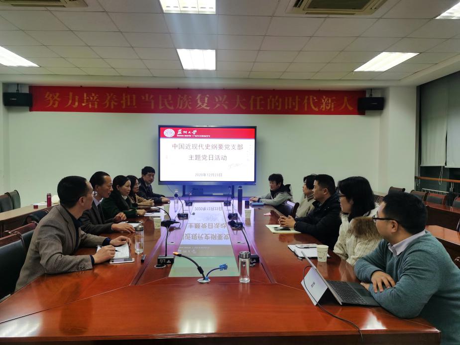 为深入学习贯彻习近平总书记在纪念中国人民志愿军抗美援朝出国作战70周年大会上的重要讲话精神,坚定教师理想信念,增强支部凝聚力、战斗力、向心力,充分发挥党建引领作用,进一步提升教研室建设质量,12月23日,苏州大学马克思主义学院纲要党支部和教研室举行“铭记历史 砥砺奋进”主题党日活动暨期末集体备课会。苏州大学马克思主义学院党委书记陈建军应邀到会指导。副院长朱蓉蓉教授、学院党委委员许冠亭教授、纲要党支部书记范敏华副教授、教研室主任孙锡平副教授、副主任高志斌老师、段星副教授、胡小君副教授、胡绿叶副教授、李燕老师、汤葆青老师和顾梦婷老师、李亚熙老师、研究生思政课教学改革“行动支部”书记吉启卫老师、学院党委专职组织员蒋慧老师、研究生李彦蓓等16人一同参加会议。会议分别由纲要党支部书记范敏华副教授和纲要教研室主任孙锡平副教授主持。