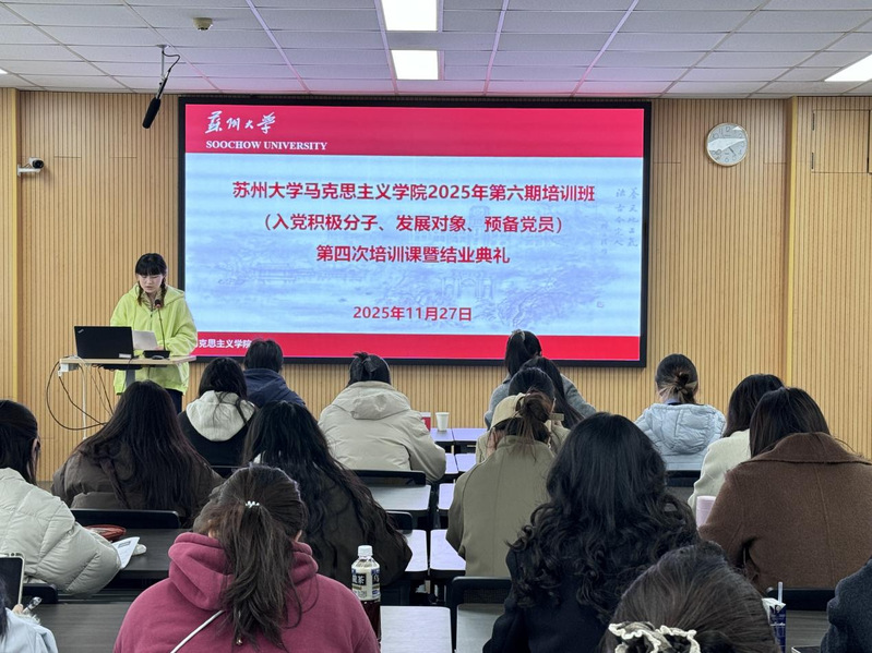 11月27日,苏州大学马克思主义学院分党校2025年第六期培训班第四次培训课暨结业典礼在东校区东教楼516顺利举行。学院党委书记茅海燕、党委专职组织员王静、副教授顾梦婷出席活动,学生党员服务中心成员及本期培训班入党积极分子、发展对象、预备党员等全体学员参加,活动由培训部工作人员主持。