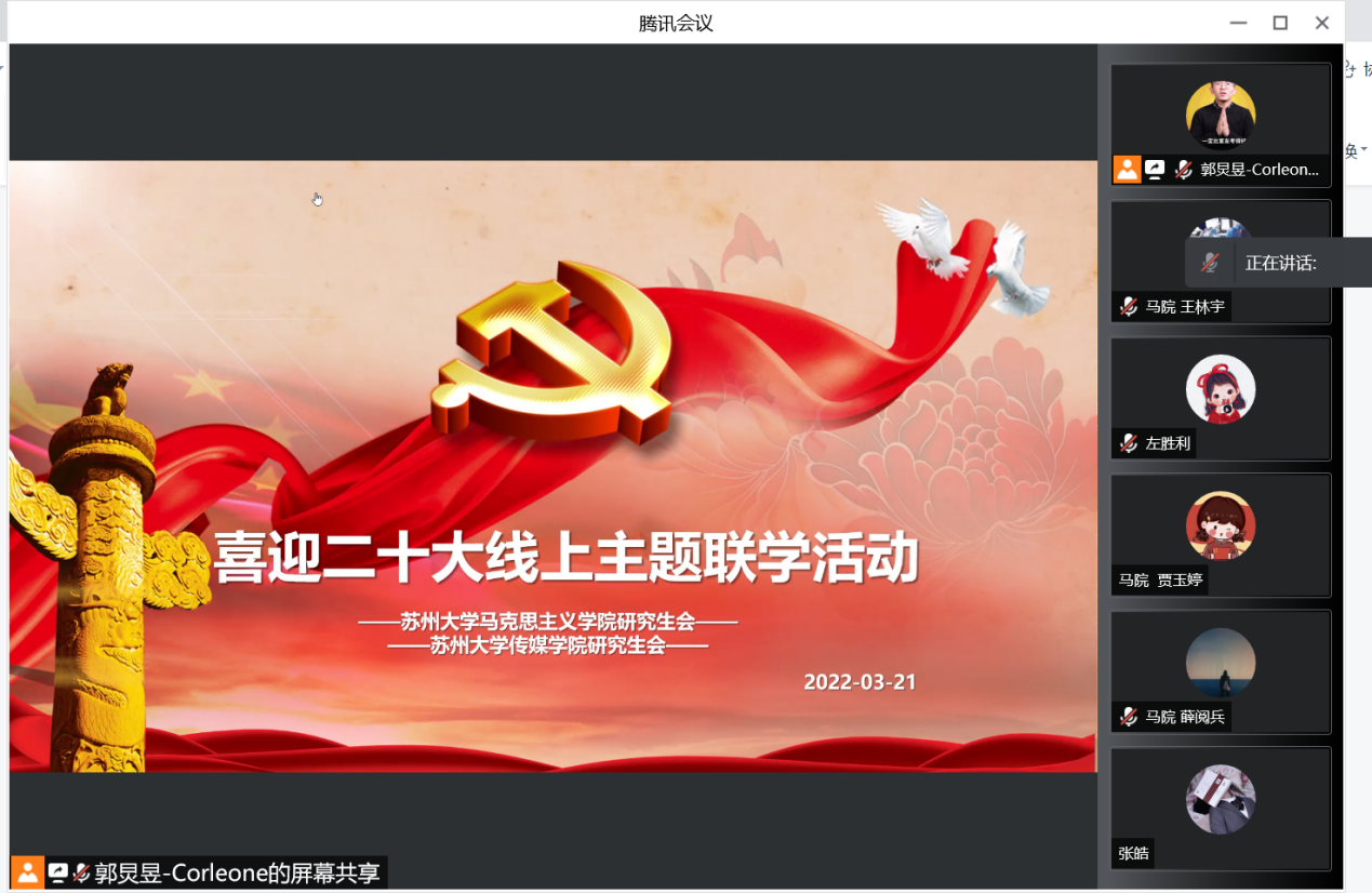 3月21日,苏州大学马克思主义学院与传媒学院联合举办“喜迎二十大”主题在线学习活动。活动由马克思主义学院、传媒学院共同主办,马克思主义学院研究生会和传媒学院研究生会承办。活动由传媒学院硕士生郭炅昱主持。