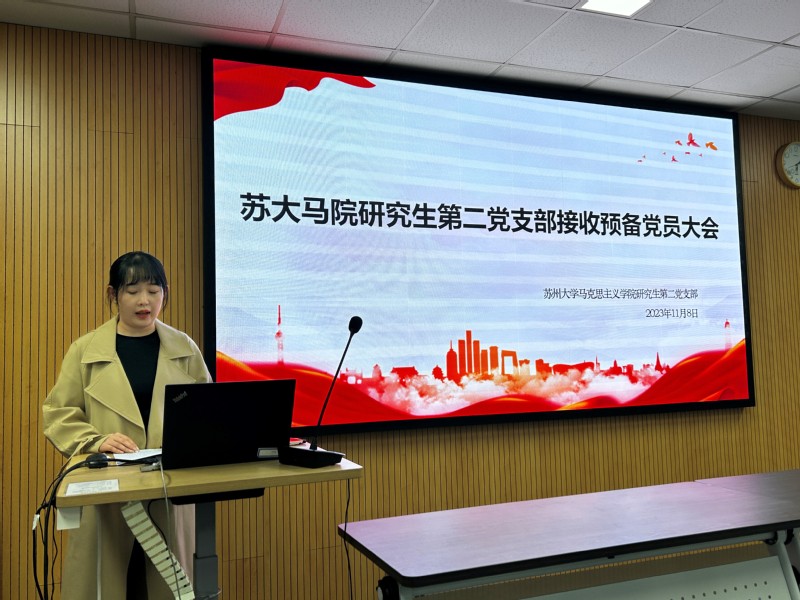 11月8日,苏州大学马克思主义学院研究生第二党支部于天赐庄校区东教楼516教室召开关于接收刘燕萍同志为预备党员的支部大会。会议由支部书记王鑫宇同志主持。