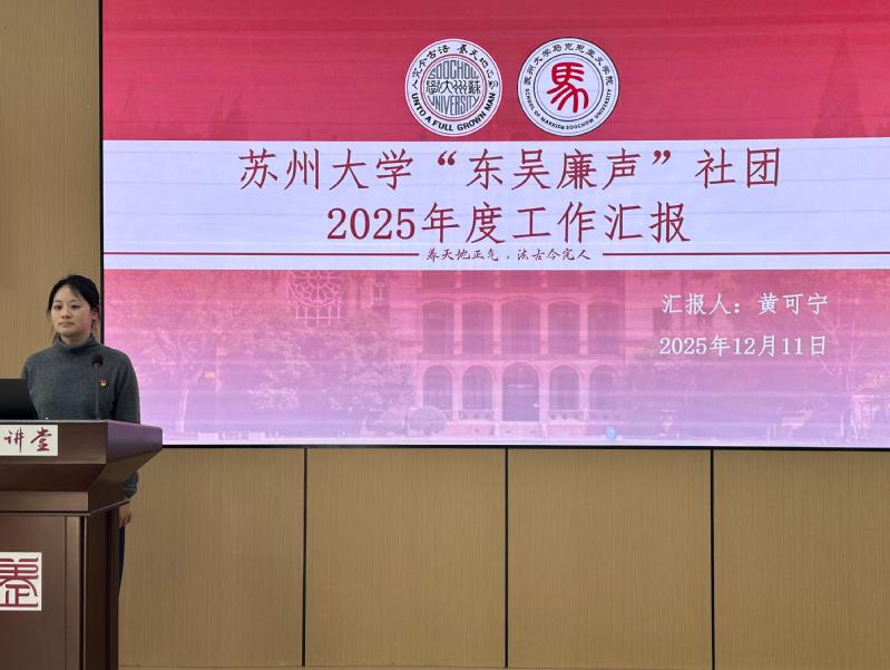 “东吴廉声”廉洁文化社团是在校纪委办公室与马克思主义学院党委、团委指导下成立的唯一以廉洁为主题的校级社团。活动现场,黄可宁从“研究、宣讲、实践”三个方面详细汇报了社团一年来的建设成果。随后,与会同志共同观看了社团成员在2025年苏州大学廉洁教育系列活动中的获奖作品《承况公勤廉之风 做实干有为青年》《承勤俭节约本色 扬清正廉洁新风》。两部作品分别以苏州历史名人况钟和暴式昭的勤廉精神为核心,通过微视频用青春视角诠释廉洁内涵,号召新时代青年弘扬艰苦奋斗、勤俭节约的风尚。