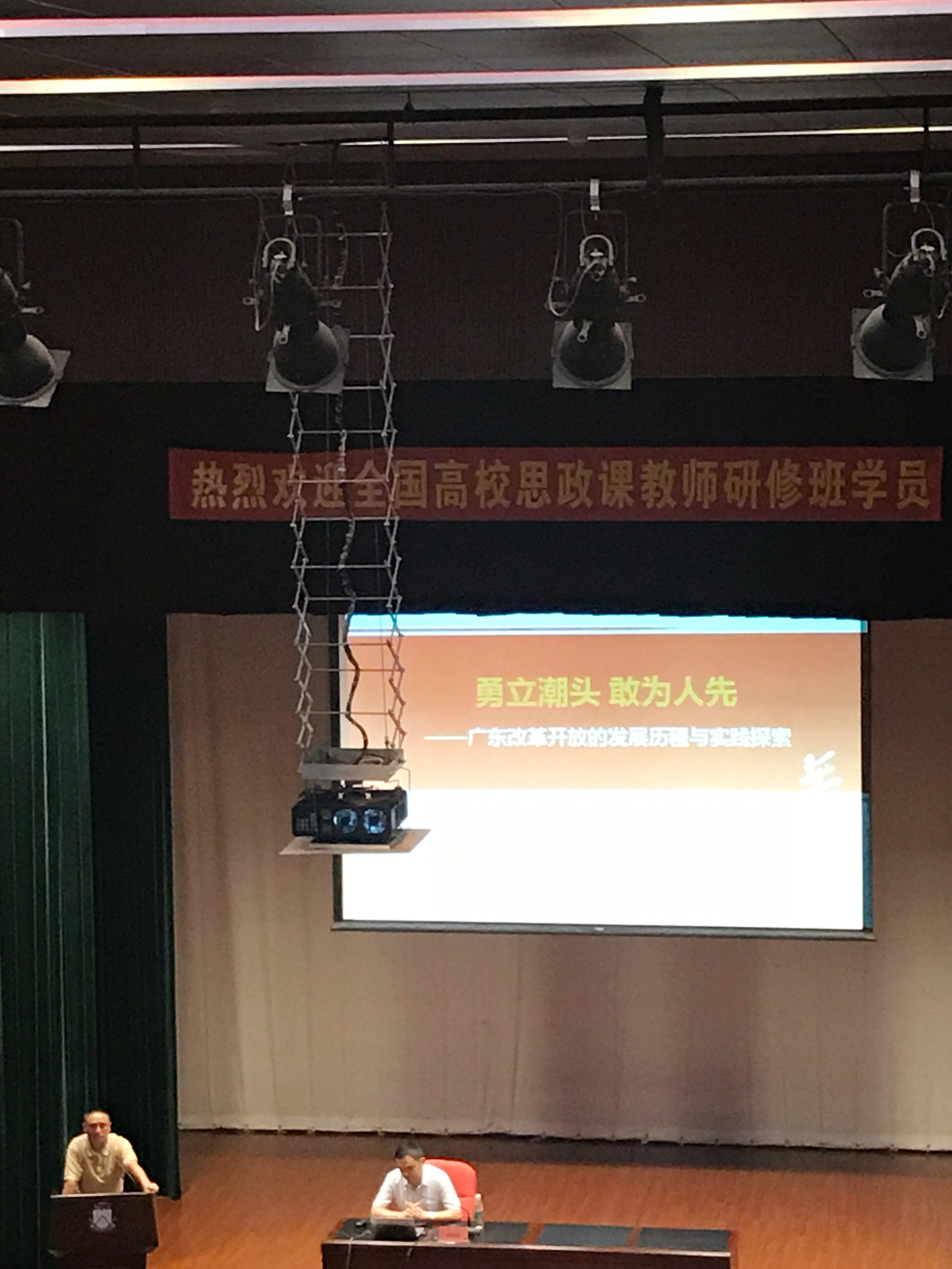 理论学习阶段,教育部“长江学者奖励计划”特聘教授、华南师范大学马克思主义学院院长陈金龙教授作了“关于道路自信、理论自信、制度自信、文化自信的若干思考”的报告。报告从“四个自信”提出的背景、“四个自信”的实质、“四个自信”的特征、“四个自信”的功能、提升“四个自信”的路径这五个方面,高屋建瓴地引导研修教师理解中国特色社会主义自信是建筑在马克思主义理论基础之上的,我们在改革中守正出新,不断深化对共产党执政规律、社会主义建设规律的认识,不断实现中国特色社会主义实践的创新飞跃都离不开马克思主义的科学指导。广东理论宣传青年优秀人才、华南师范大学马克思主义学院副院长胡国胜教授在“勇立潮头,敢为人先——广东改革开放的发展历程与实践探索”的报告中,从广东改革开放的发展历程、主要成就、历史经验、存在的问题和全面改革开放再出发这五个方面深入分析,研修教师对广东坚持改革开放的发展脉络和实践探索有了更加清晰的认识和了解。两场高质量的报告使老师们更加坚定了对“四个自信”和改革开放的高度认同。