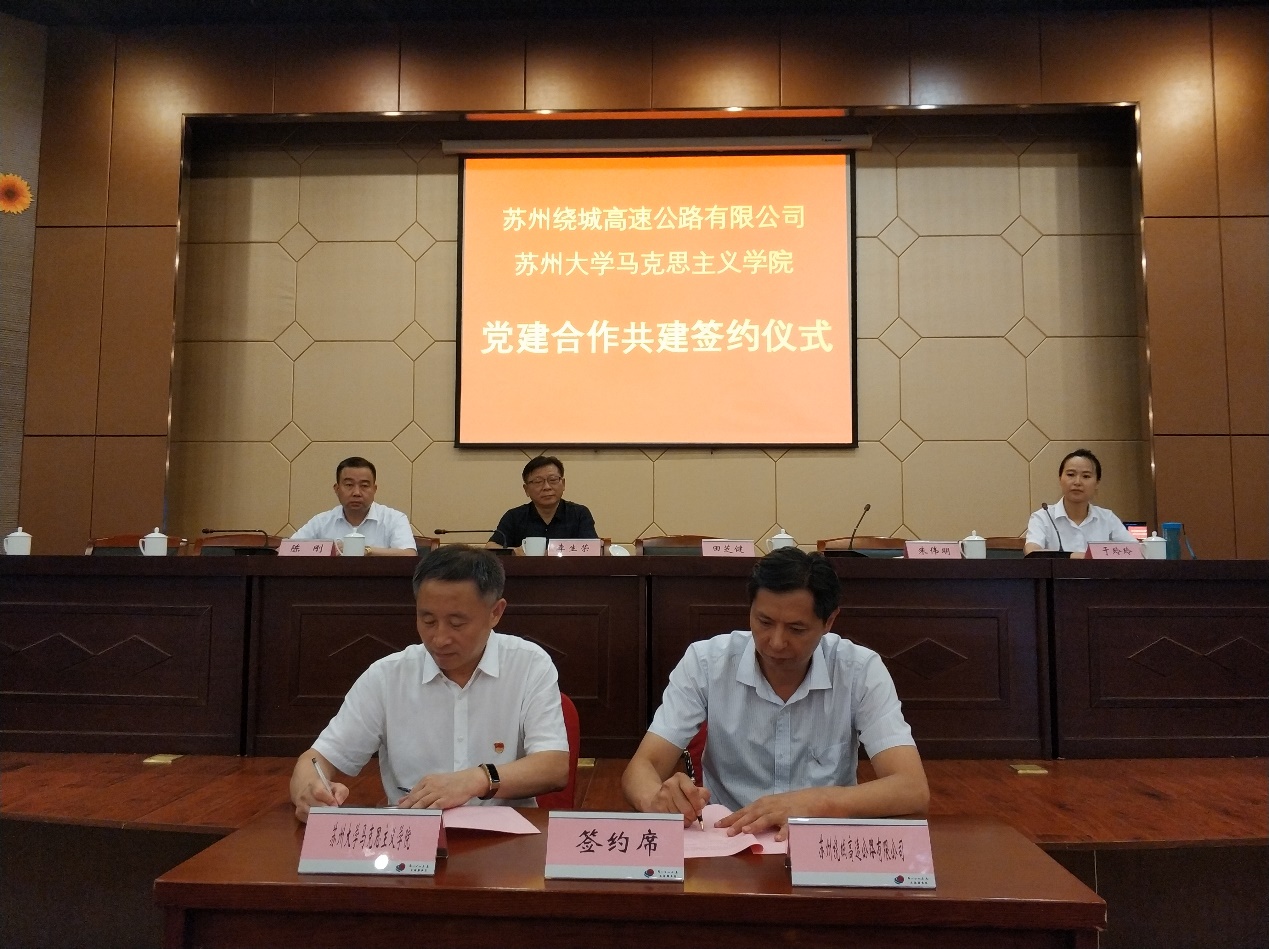 7月31日下午,苏州大学马克思主义学院与苏州绕城高速公路有限公司党建合作共建签约仪式在太湖服务区会议中心举行。苏州市交通运输局党委委员、市纪委第十六派驻纪检组组长李生荣,绕城公司党委书记、董事长朱伟明,苏州大学马克思主义学院院长、博士生导师田芝健教授,苏州大学马克思主义学院政党与国家治理研究中心副主任吉启卫、马克思主义学院习近平新时代中国特色社会主义思想研究会会长毛瑞康及绕城公司全体党员参加了会议。