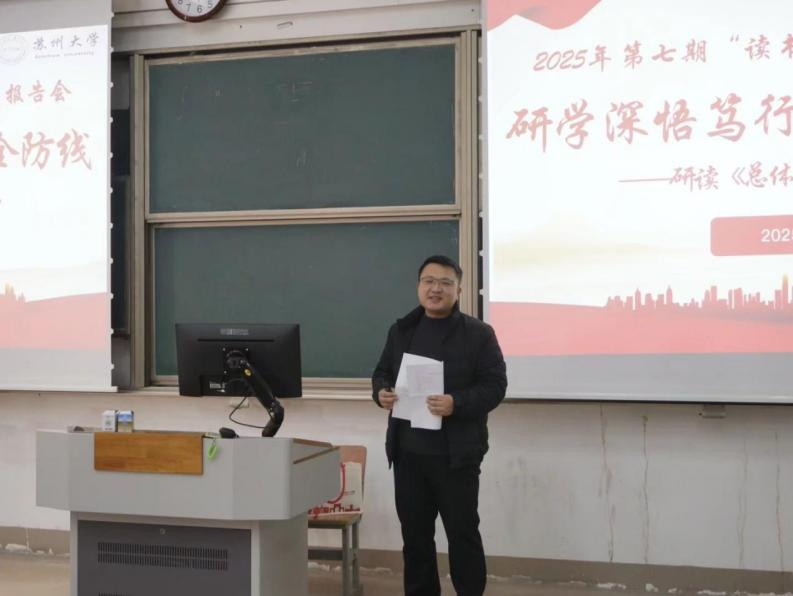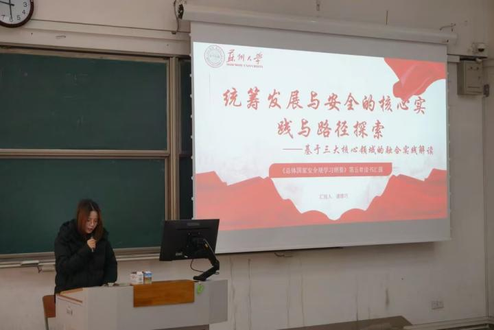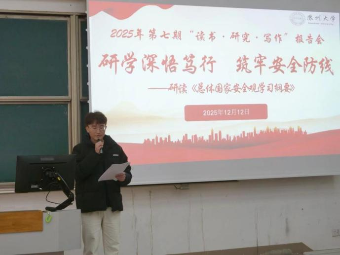 12月12日,苏州大学马克思主义学院2025年第七期“读书·研究·写作”报告会在苏州大学东校区东教楼115举办。本次报告会以“研学深悟笃行 筑牢安全防线”为主题,师生共同研读《总体国家安全观学习纲要》。活动由苏州大学马克思主义学院主办,全国高校思政课名师工作室(苏州大学)、学院研究生会、学生会、思想政治教育研究会承办。活动由2025级硕士研究生曾宪辉主持。