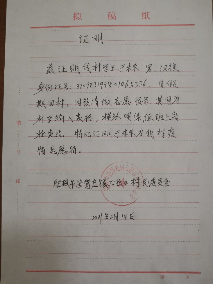 在山东省泰安市肥城市安驾庄镇三岔口村,苏州大学马克思主义学院2020级硕士研究生于未未返乡后积极响应镇政府和村委的号召,报名参加到家乡疫情防控志愿服务工作成为了一名防疫志愿者,密切配合当地疫情防控工作。于未未的主要工作是排查疫情中高风险地区返乡人员,及时统计并整理外来人员登记表,进行核酸检测模拟演练,以应对突发状况等。他感慨道:“时间之河川流不息,每一代青年都有自己的责任和使命,都要在自己所处的时代描绘人生、创造价值。作为新时代青年,身为苏州大学马克思主义学院的学子,我们要积极投身家乡疫情防控工作之中,共同维护好这来之不易的良好防控局面。”