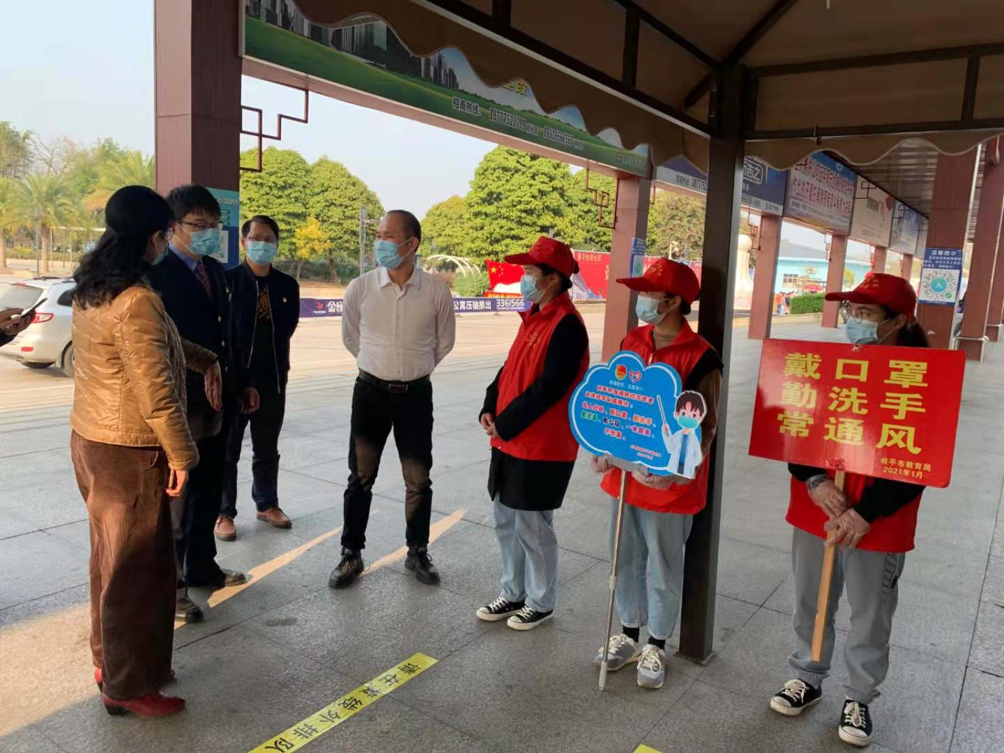 (图为桂平市副市长蒙星强视察高铁站疫情防控工作看望许力凡在内的志愿者)