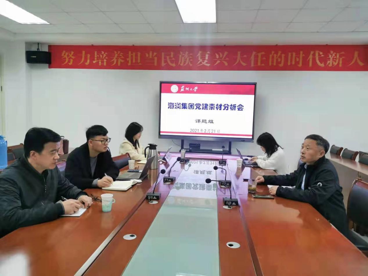 2月21日下午,苏大马院马克思主义政党与国家治理研究中心课题组召开海澜集团党建素材分析会。田芝健教授、研究团队成员杨建春副教授、师资博士后王慧莹老师、祁文博老师、以及硕士研究生王雪等参加了分析会。课题组将进一步深入调研,对海澜集团建强组织体系,发挥党建功能,引领企业高质量发展的实践案例进行专题研究。