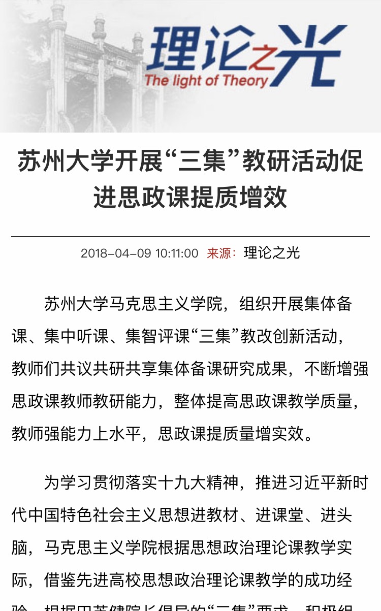 苏州大学马克思主义学院,组织开展集体备课、集中听课、集智评课“三集”教改创新活动,教师们共议共研共享集体备课研究成果,不断增强思政课教师教研能力,整体提高思政课教学质量,教师强能力上水平,思政课提质量增实效。