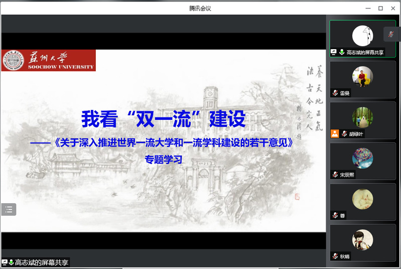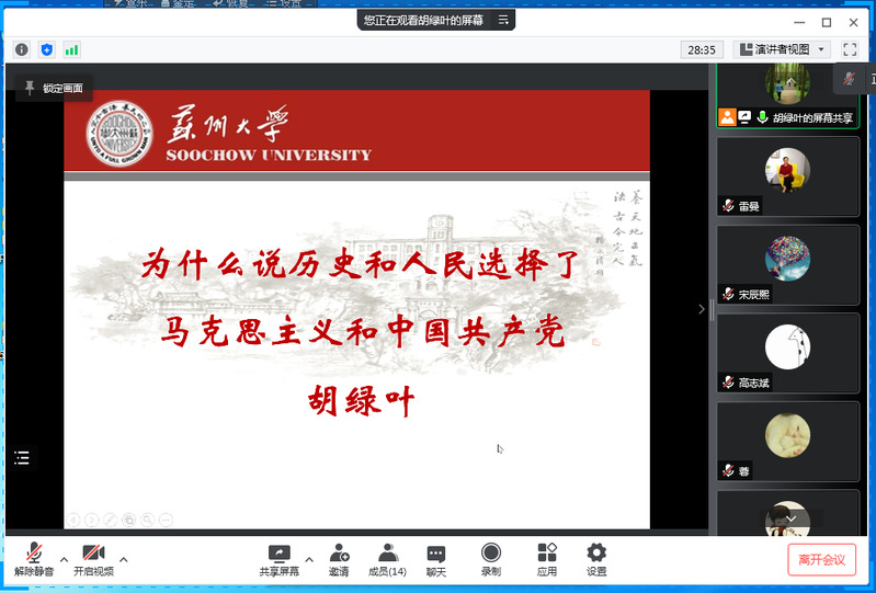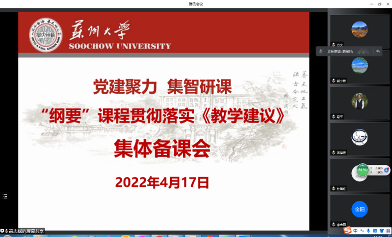 为深入贯彻教育部高校思想政治课教学指导委员会关于《党的十九届六中全会精神融入“中国近现代史纲要”课的教学建议》,2022年4月17日下午,苏州大学马克思主义学院“纲要”教研室党支部、苏州大学马克思主义学院思政名师工作室行动党支部,联合苏州大学马克思主义学院“纲要”教研室通过腾讯会议平台,开展“党建聚力 集智研课”活动。活动由胡绿叶、孙锡平共同主持,“纲要”教研室全体成员参与。活动分三个议程:一是“纲要”教研室党支部宣传委员兼纪检委员高志斌领学《关于深入推进世界一流大学和一流学科建设的若干意见》;二是“纲要”教研室党支部书记胡绿叶进行“为什么说历史和人民选择了中国共产党”专题授课;三是“纲要”教研室主任孙锡平布置下阶段课程教学工作。