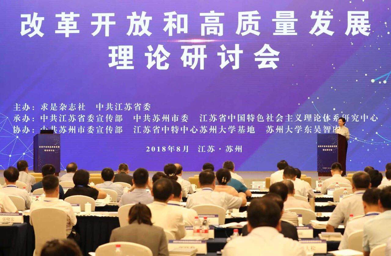 为深入学习贯彻习近平新时代中国特色社会主义思想和党的十九大精神,认真落实全国宣传思想工作会议精神。2018年8月24日,由求是杂志社和中共江苏省委共同主办的“改革开放和高质量发展”理论研讨会在苏州召开,与会的全国社科界知名专家学者、企业家代表等,围绕新时代改革开放和高质量发展积极建言献策、凝聚思想共识。