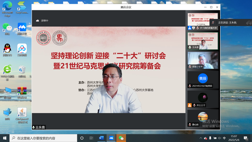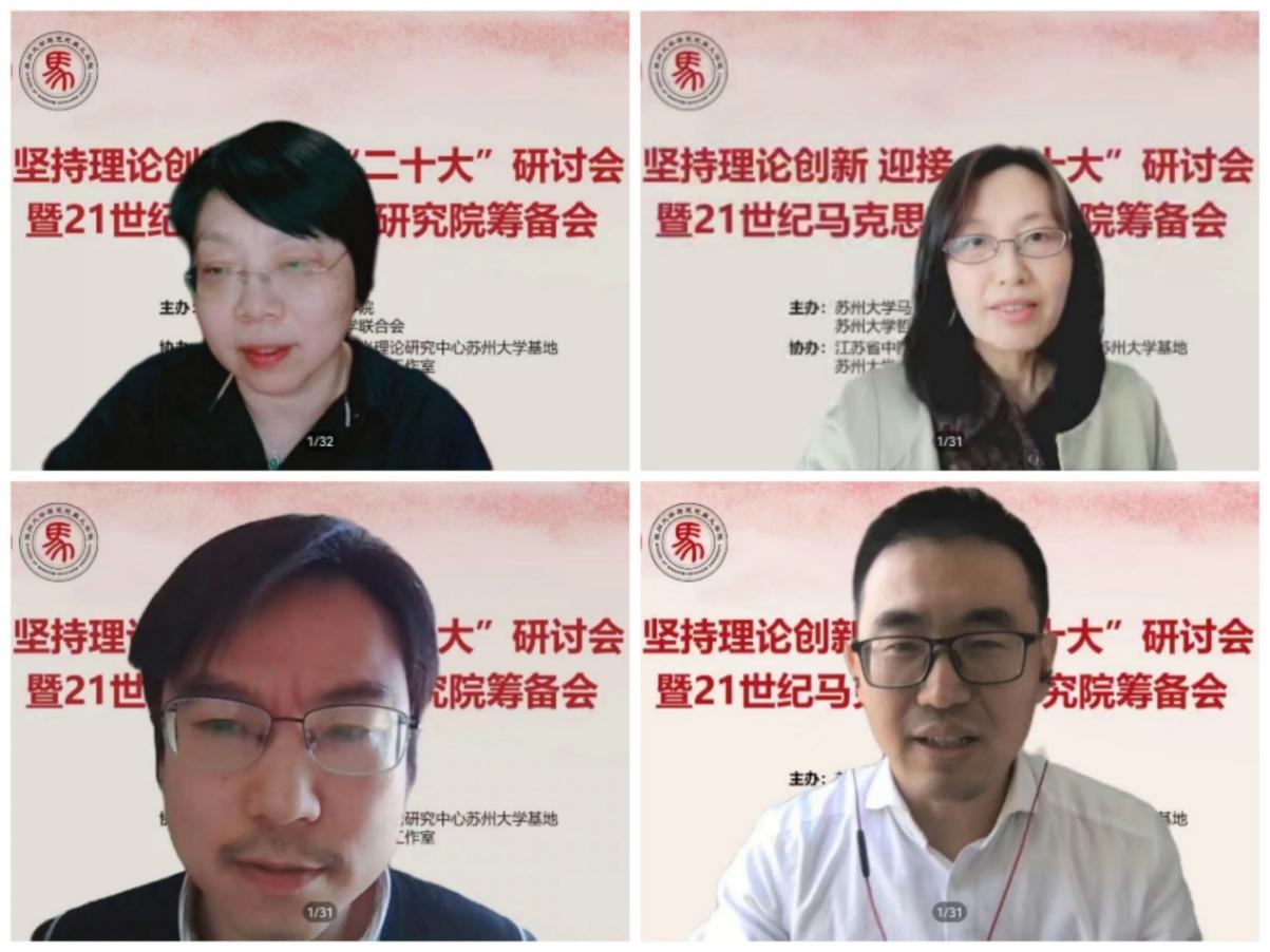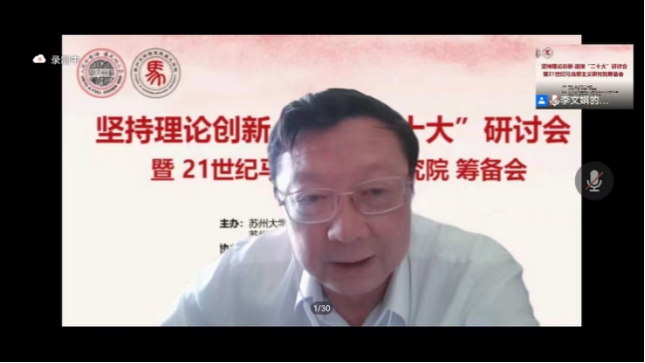 为深入学习贯彻党的十九届六中全会精神,迎接党的二十大胜利召开,充分发挥马克思主义理论学科优势,进一步加强21世纪马克思主义和党的创新理论研究,不断推动马克思主义学院高质量发展,5月6日,“坚持理论创新 迎接‘二十大’”研讨会暨21世纪马克思主义研究院筹备会顺利召开。会议由苏州大学马克思主义学院与苏州大学哲学社会科学联合会共同举办,江苏省中国特色社会主义理论体系研究中心苏州大学基地和苏州大学“思政田园”名师工作室协办。苏州大学哲学社会科学联合会秘书长、苏州大学人文社会科学处处长于毓蓝在会上致辞,苏州大学哲学社会科学联合会常务副主席、江苏社科名家、校特聘教授任平在会上讲话。中国社会科学院马克思主义研究院党委书记、副院长、中国社会科学院大学马克思主义学院院长辛向阳教授,南京师范大学教授、苏州大学讲座教授王永贵,苏州大学特聘教授、东吴智库首席专家方世南等出席研讨会并作主旨报告。苏州大学马克思主义学院院长田芝健作总结讲话。苏州大学马克思主义学院教职工、硕博士研究生,苏州大学思政课教师发展中心教师、江苏省中国特色社会主义理论体系研究中心苏州大学基地研究员等参加了会议。会议由苏州大学马克思主义学院党委书记陈建军主持。