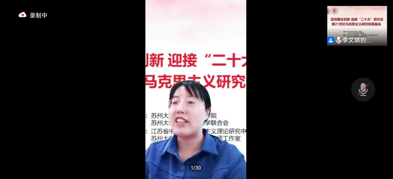 在研讨交流环节,苏州大学马克思主义学院副院长朱蓉蓉教授从党的创新理论融入思政课教学的视角分享了自己的心得体会,她从“术、学、道”三个维度进行了阐述,并指出,思政课教师只有通过认真备课和深入研究先把道理认识深、把握透,才能在教学中把道理讲深讲透讲活,才能让学生在感受理论魅力的基础上实现能力培养和价值观培养。博士生导师杨渝玲教授结合具体的工作实践分享了自己的学习体会,她表示要以21世纪马克思主义研究院这个平台为支撑,发挥学科专业优势,增强科研信心决心,努力攻坚克难,在21世纪马克思主义重大理论研究上取得新进展。博士生导师、博士生思政课教研室主任宋德孝教授从历史的方向性、中国共产党百年历史的基本经验、党和国家未来的发展方向三个方面作研讨交流,他指出,党的百年历史探索历程中,以马克思主义的历史主义精神为方法论,结合中国的实践经验,开创出了一条不同于西方的现代化道路,这是我们党百年来奋斗的基本指向,对此我们要深入研究、多出精品成果。马克思主义理论学科办公室主任、原理教研室主任张晓副教授指出,在学校党政高度重视、校社科联和人文社科处大力指导支持下,筹备成立21世纪马克思主义研究院,意义重大;学科办和原理教研室将发挥优势,积极落实、务实推进21世纪马克思主义研究工作,深入研究、阐释、宣讲习近平新时代中国特色社会主义思想、当代中国马克思主义、21世纪马克思主义,在加强教学科研中提高人才培养质量和学科建设水平。