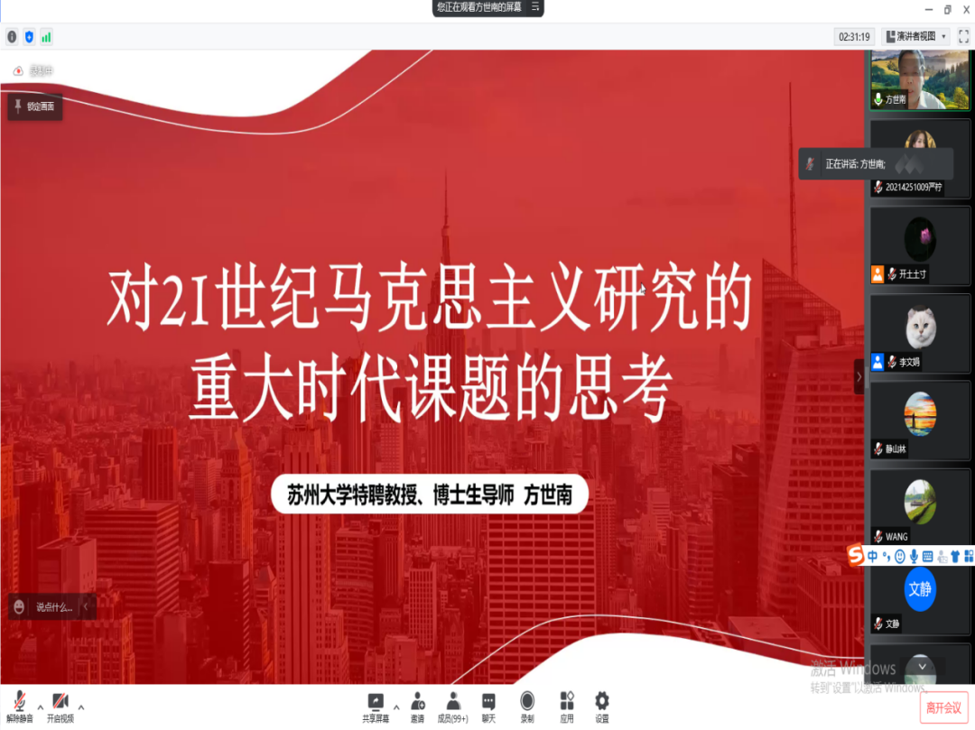 苏州大学特聘教授、东吴智库首席专家方世南作了题为“对21世纪马克思主义研究的重大时代课题的思考”的主旨发言。方世南教授梳理了希望我们去深入研究的21个重大课题,涉及中国特色社会主义理论体系创新发展、中国式现代化道路和人类文明新形态、系统性风险的重点领域和重点对象、新时代中国共产党人的共同体思想、中国城乡文明协调发展、我国社会阶层结构发生深刻变化等一系列存在内在包含关系的课题。他强调要聚焦重大课题,明确21世纪马克思主义研究院的研究方向,构建优势、形成特色。