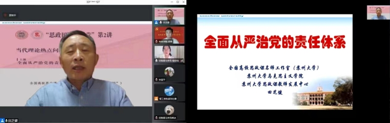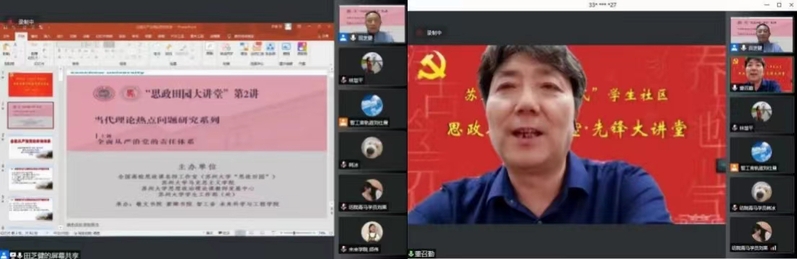 5月28日,全国高校思政课名师工作室(苏州大学)进“一站式”学生社区举办专题讲座课。由苏州大学马克思主义学院、苏州大学思想政治理论课教师发展中心、苏州大学学生工作部(处)共同主办的“思政田园大讲堂”(第2讲)暨先锋大讲堂,通过腾讯会议和线上直播方式举行。苏州大学马克思主义学院院长、全国高校思政课名师工作室(苏州大学)主持人田芝健教授作了“全面从严治党主体责任体系”专题讲座课。学生工作部(处)部(处)长董召勤,学生工作部(处)副部(处)长潘爱华,敬文书院党委副书记、副院长胡萱,紫卿书院党委副书记、副院长虞岚,轨道交通学院党委副书记、副院长胡洋,未来科学与工程学院党委副书记、副院长陈贝贝,轨道交通学院学工办副主任刘仕晨,思政名师工作室行动支部书记胡绿叶,思政名师工作室办公室主任林慧平,以及来自敬文书院、紫卿书院、智工舍、未来科学与工程学院近400余名师生参会。活动由董召勤部(处)长主持。